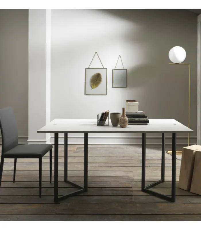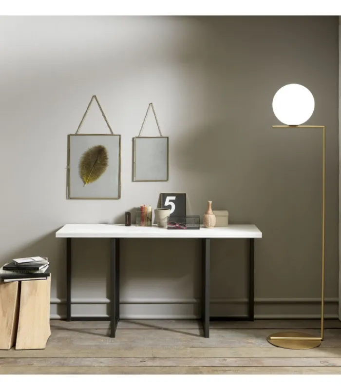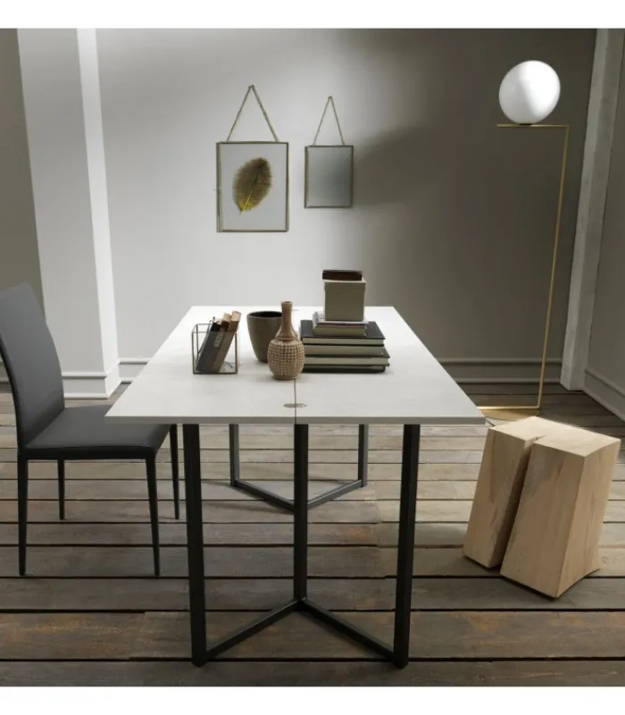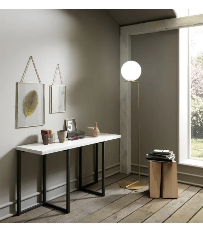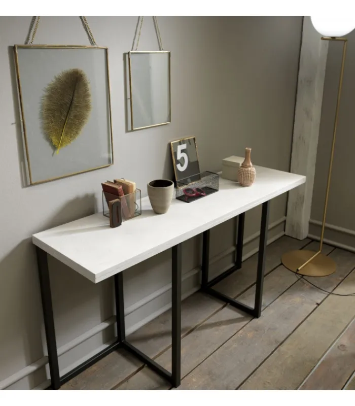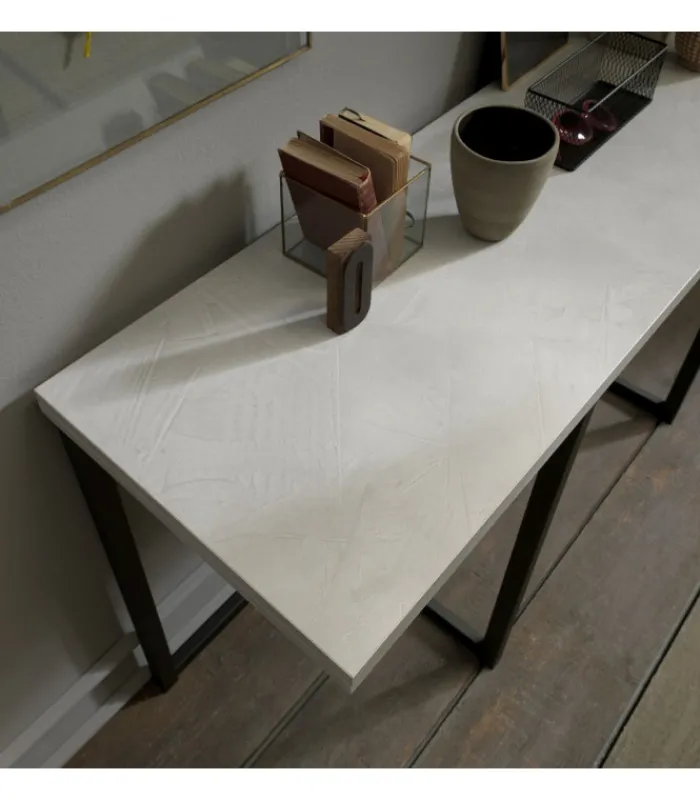 Consolle estensibile, struttura in metallo, piano raddoppiabile a libro in nobilitato o effetto malta. Piano malta: lato interno in nobilitato.