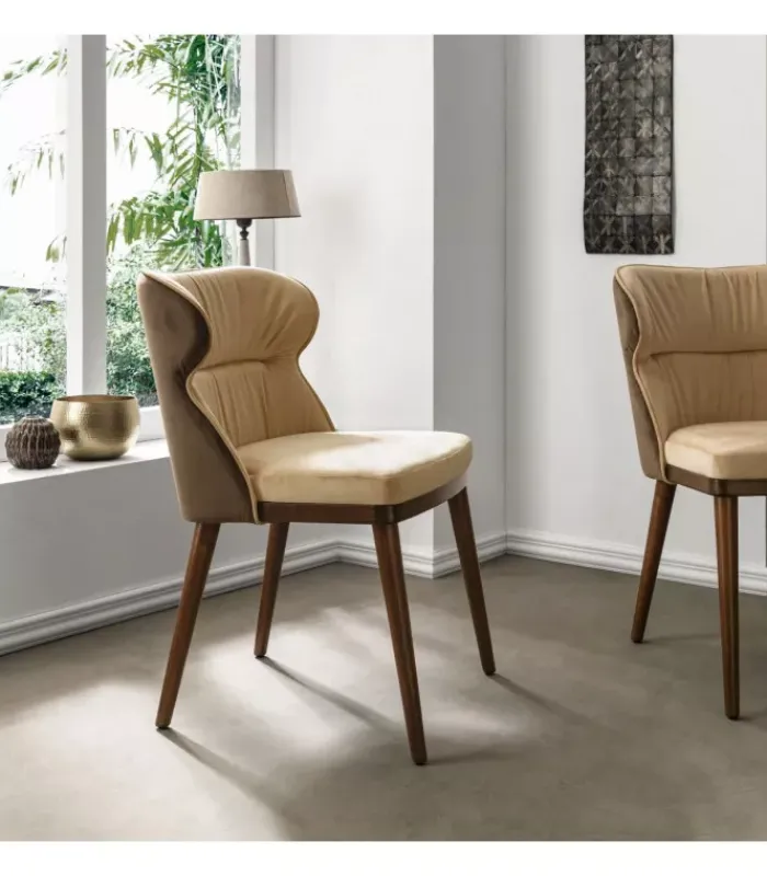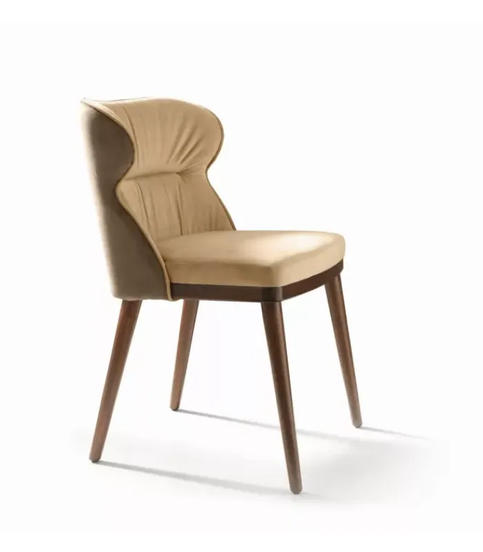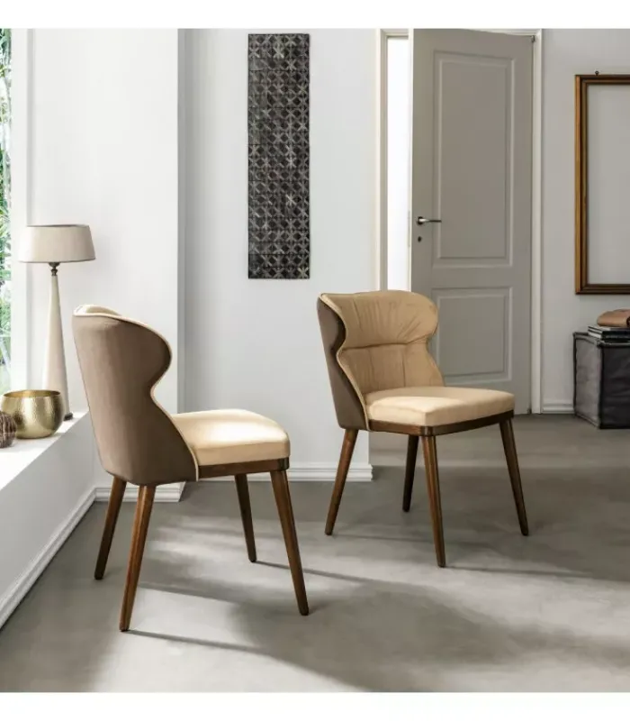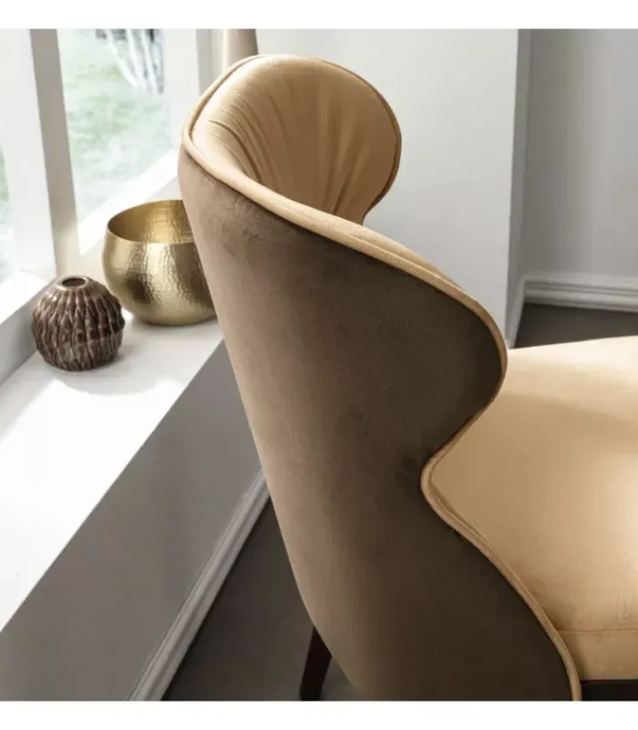 Poltroncina con gambe in legno massiccio. Scocca bicolore rivestita di velluto. Cuciture in tinta.