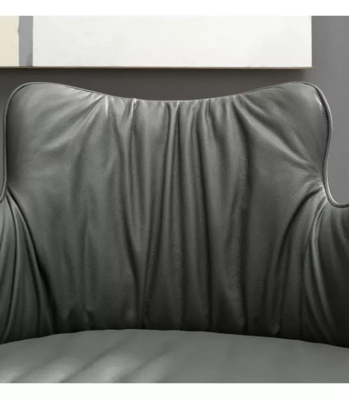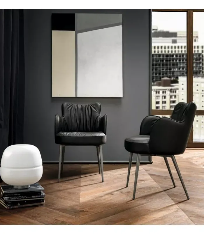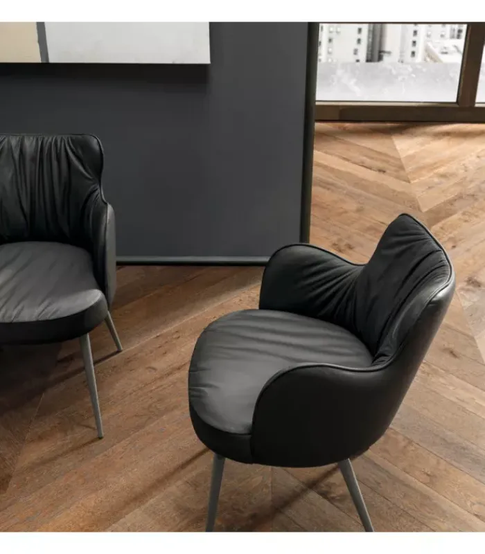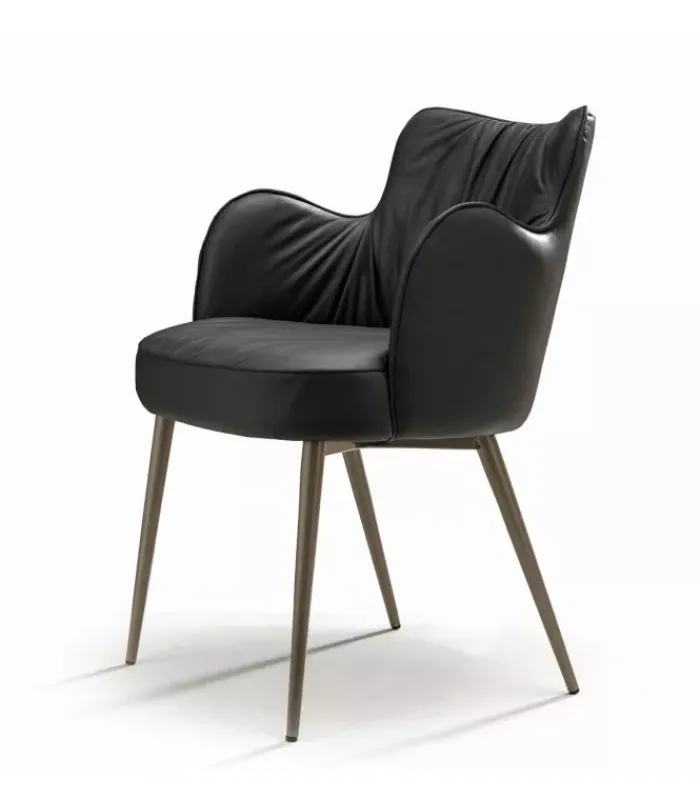Poltroncina con schienale in legno rivestito e gambe coniche in metallo verniciato. Cuciture e profilo in tinta.