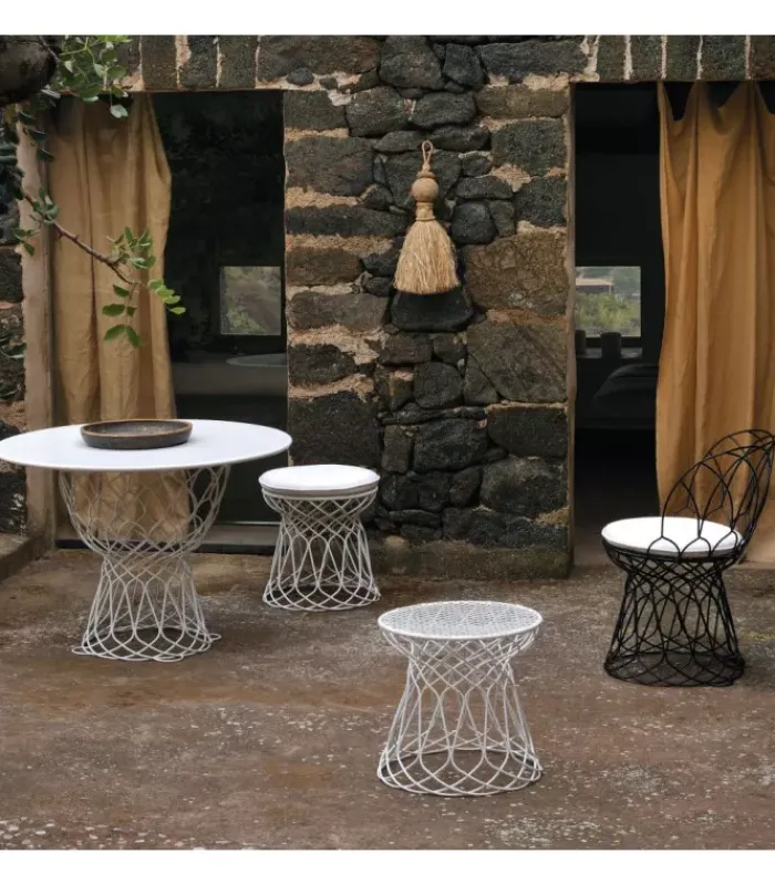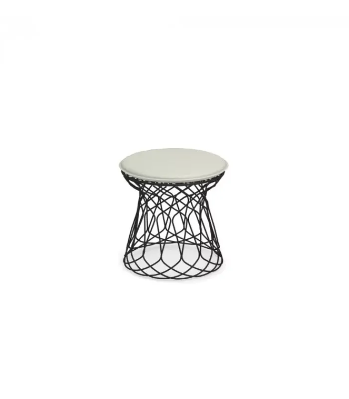 Pouf con struttura e seduta in acciaio verniciato. È accessoriabile di cuscino per la seduta. È disponibile in due colori.