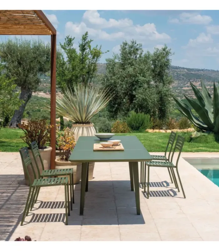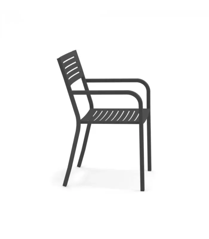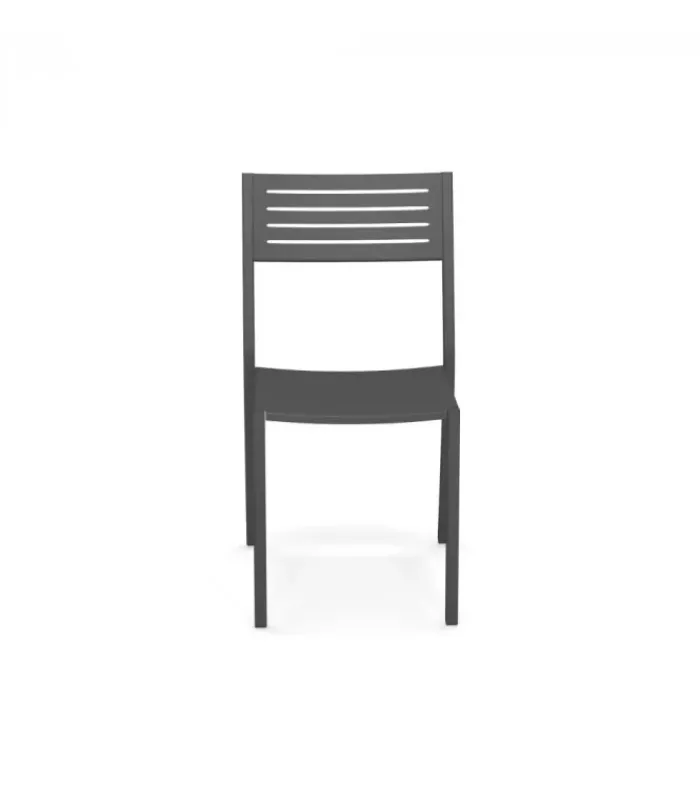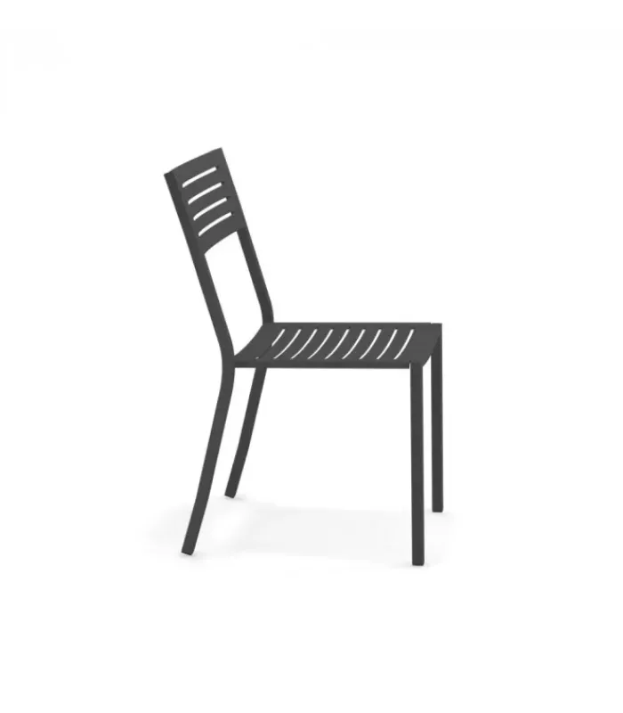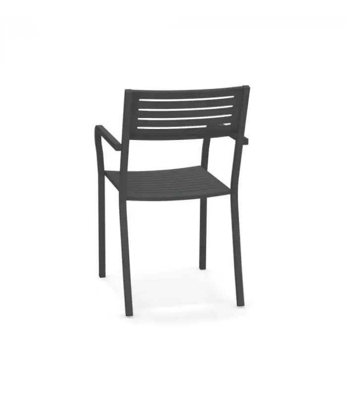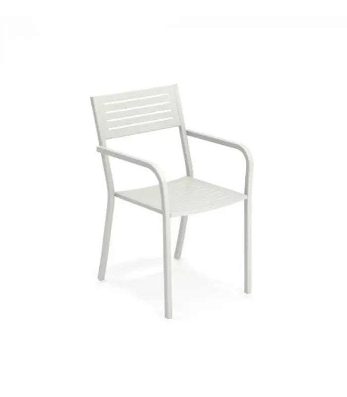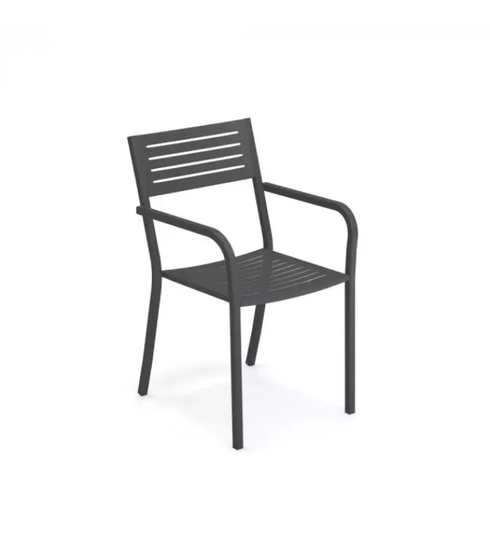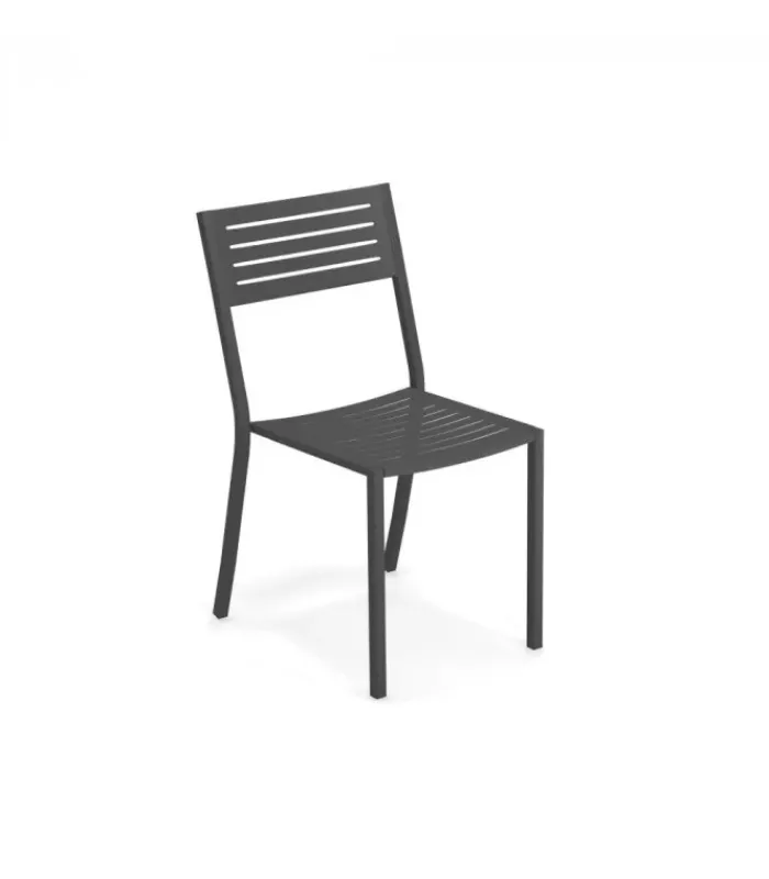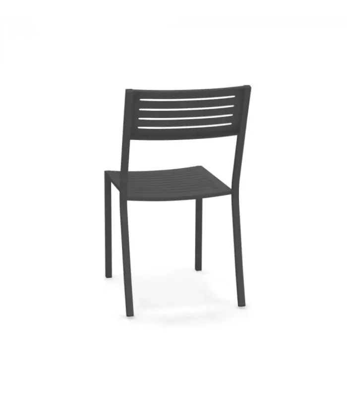 Sedia con struttura (con o senza braccioli) in acciaio verniciato, la seduta e lo schienale sono in lamiera pre zincata a caldo e verniciata. È disponibile in cinque colori diversi ed è accessoriabile di cuscino. È impilabile (per un massimo di 8 sedie impilate) ed è venduta in stock da 4 sedie.