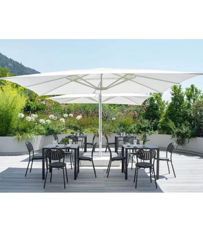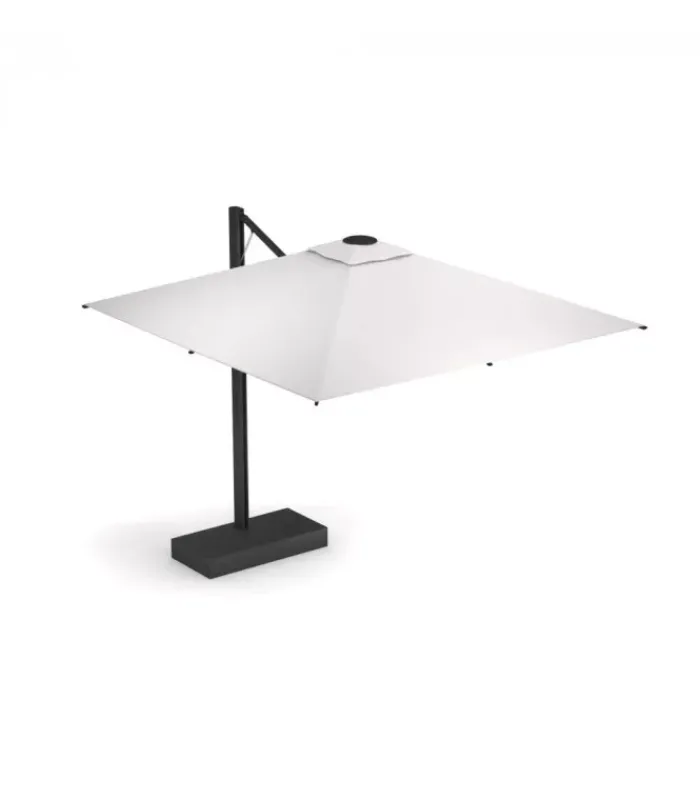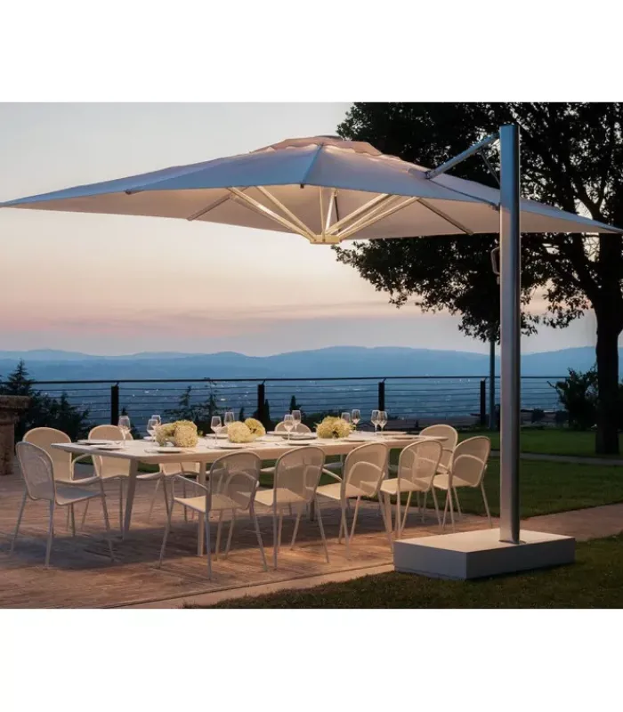 L’ombrellone Shade Pro ha una struttura in alluminio e il telo in tessuto acrilico. L’apertura e chiusura dell’ombrellone è agevolata dall’ausilio di una molla a gas che, agendo su un opportuno sistema di leve, riduce la forza necessaria alle manovre di apertura e chiusura. Il dimensionamento e i leveraggi realizzati permettono all’ombrellone di chiudersi agevolmente senza la necessità di dover spostare tavoli, oltre alla possibilità di ruotarlo sul piano orizzontale. Shade Pro è anche dotato di un sistema illuminante composto da 4 barre led, da un telecomando e da un quadro elettrico. Il telecomando alimentato mediante batterie è dotato dei seguenti pulsanti: accensione, spegnimento, tre intensità luminose preimpostate, scelta tra luce calda e luce fredda (gradi Kelvin). I LED hanno un’ alimentazione a 230 volt, luce dimmerabile 40 watt (4×10 watt). È accessoriabile di cover e di kit per il fissaggio a terra (o a muro).