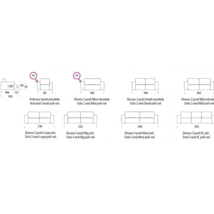 - IMBOTTITURA – Cuscino seduta fissato al telaio in espanso indeformabile con densità D35SR, rivestito con resinato di poliestere 200 gr. Cuscino schiena in poliuretano espanso flessibile e indeformabile in densità D16S rivestito in falda termolegata da 300 gr. Parti di tamponamento schiena e braccioli rivestiti con espanso indeformabile densità 35 FR. Il tutto rivestito con resinato 200 gr. poliestere accoppiato a vellutino in maglina.