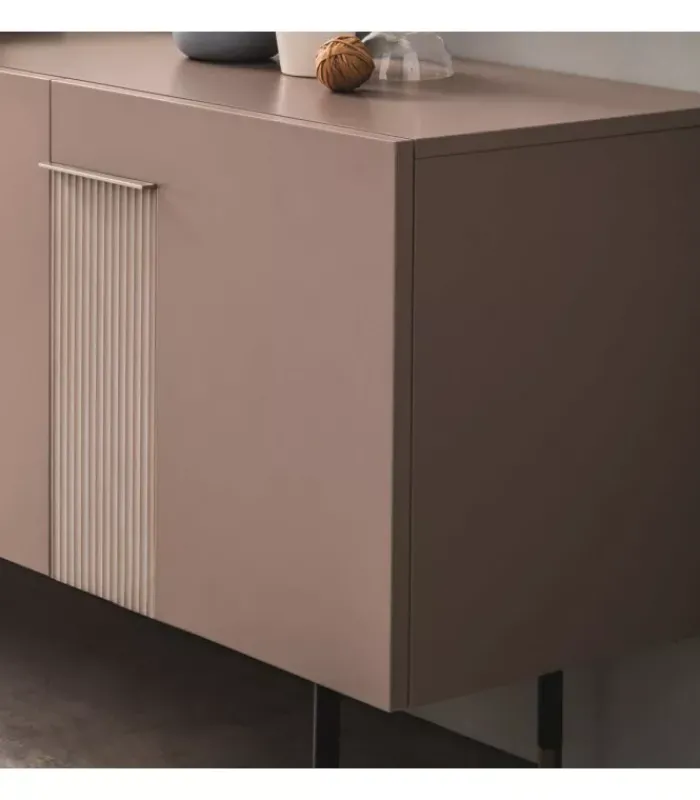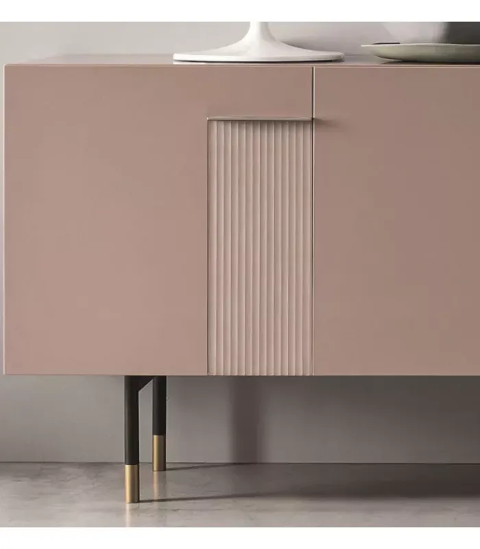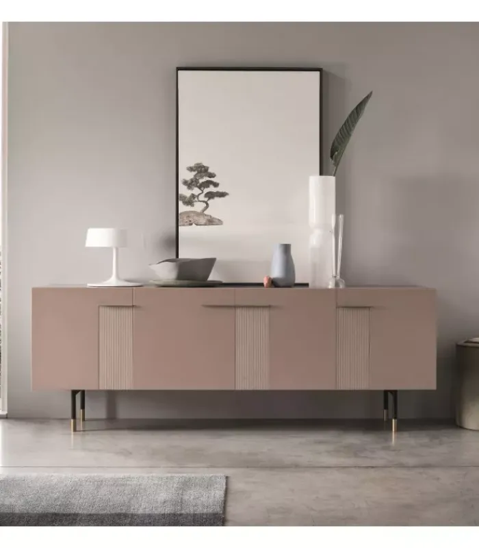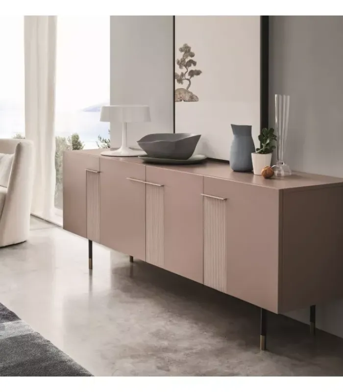 Madia con quattro ante, disponibile in tre diverse dimensioni. È accessoriata di tre ripiani interni in legno (sp. 18 mm). È disponibile con la struttura e i frontali/top in melaminico, in laccato opaco e in laccato lucido. La struttura interna nella versione laccata opaca/lucida sarà in melaminico ghiaccio. Madia montata (smontabile). Si consiglia l’ancoraggio a muro. Apertura con maniglia laccata opaca.
