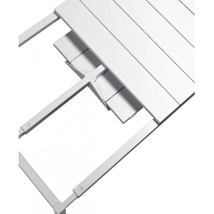 La struttura del tavolo, con allunga laterale telescopica a filo gamba, è realizzata in alluminio verniciato mentre il piano e le sedie sono in polipropilene colorato in massa, e non verniciati solo superficialmente.