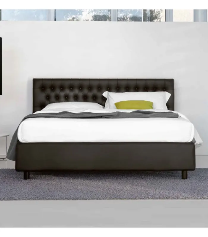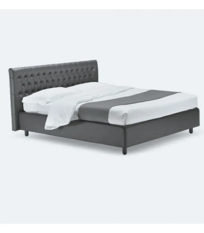 Letto DIZZY disponibile con contenitore (con due sistemi di apertura differenti) o fisso. La testata è imbottita e rivestita, come il contenitore e sono disponibili in pelle, ecopelle o tessuti antimacchia. Il rivestimento non è sfoderabile, ed il contenitore include la rete ortopedica a doghe con doppio palo di sostegno centrale con 14 doghe in betulla da 65 millimetri.