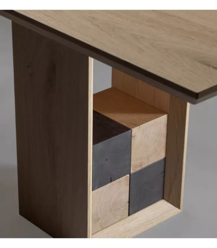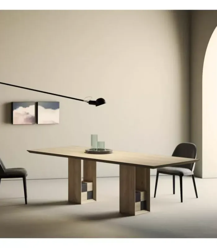 Il basamento del Tavolo Fill è realizzato con cura utilizzando un impiallacciato bisellato e decorato con quadrotti, che aggiungono un tocco di raffinatezza e originalità al design complessivo. Questo basamento conferisce al tavolo una stabilità solida e una presenza scenica che non passerà inosservata.