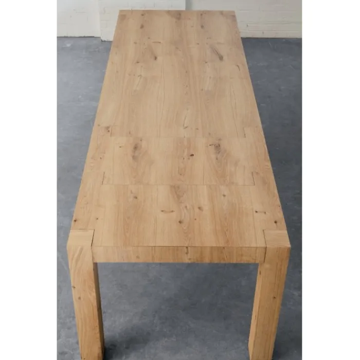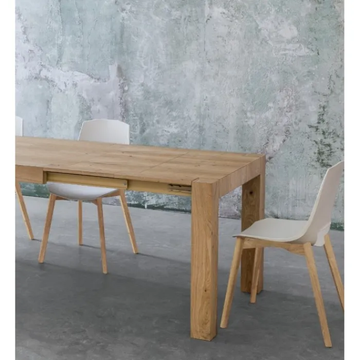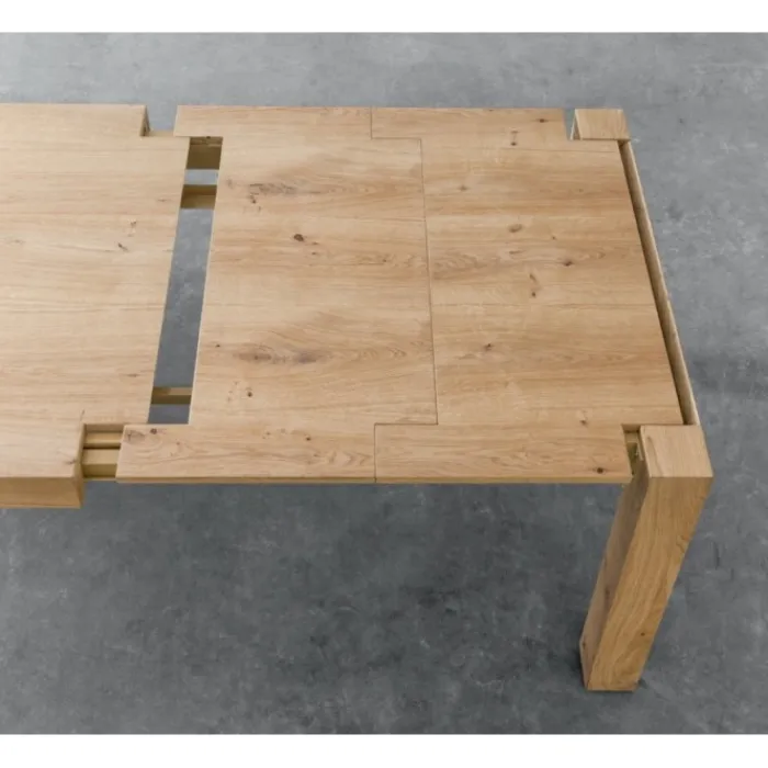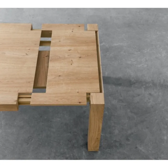 Tavolo allungabile per il soggiorno e la cucina, con struttura interamente impiallacciata in rovere nodato, supportata al suo interno da un telaio in metallo verniciato a polveri epossidiche.