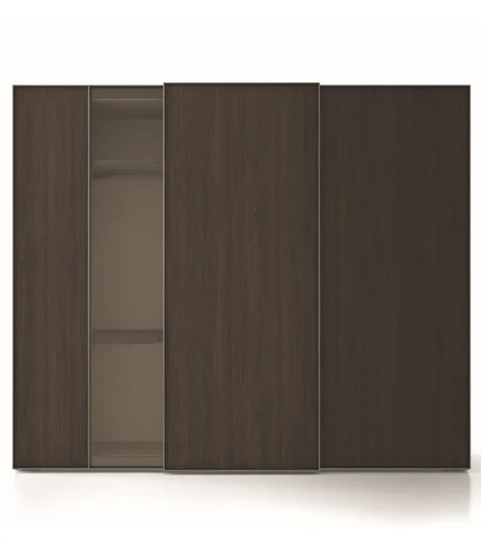 L’anta di questo armadio è composta da un telaio in alluminio color titanio, all’interno ci sono racchiusi dei pannelli laccati, in essenza oppure in tre tipologie tra vetri e specchi.