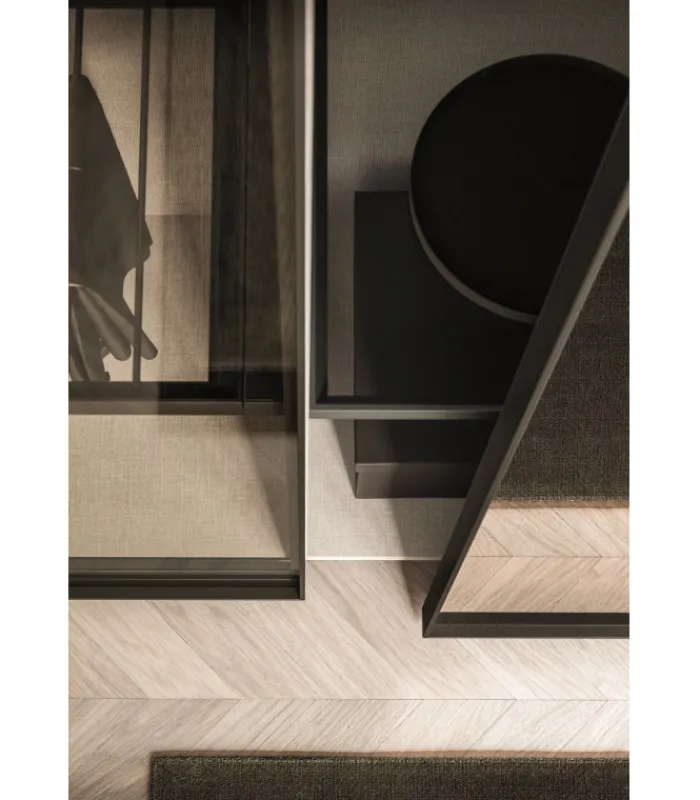 Nuit è forse il paradigma di cosa intendiamo per equilibrio tra “stile” e “funzione”. Il telaio consente una segmentazione dell’anta in settori orizzontali o verticali. Questa possibilità agevola un gioco estetico tra materiali e finiture diverse assolvendo la volontà di avere un armadio elegante e non stravolgente.