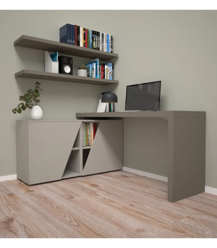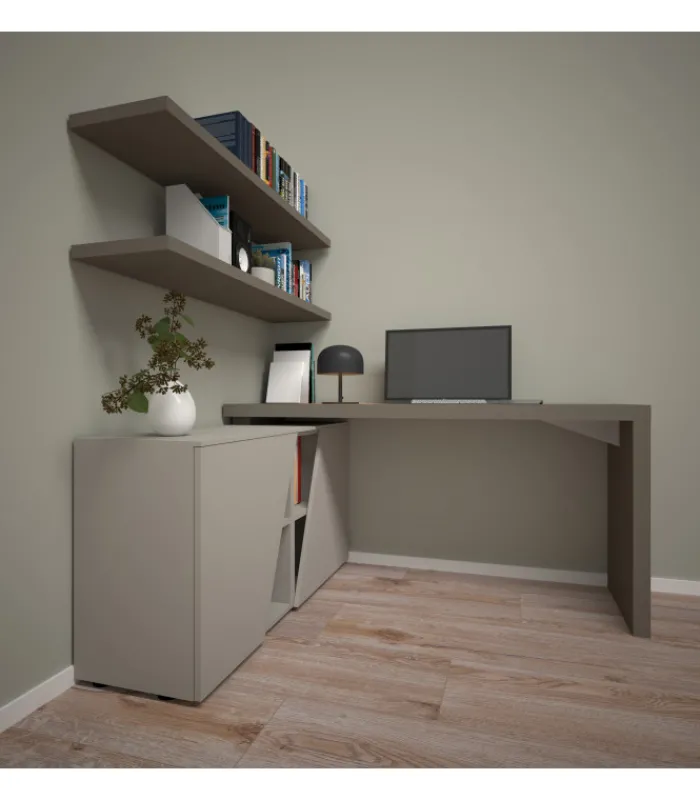 Composizione composta da particolari moduli contenitivi caratterizzati da un’anta con tagli inclinati e vani a giorno per esporre gli oggetti più belli o di uso quotidiano. La scrivania poggia sulle particolari basi , formando una composizione ad “L”.