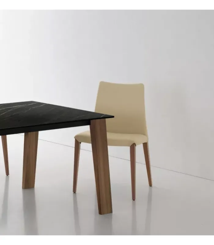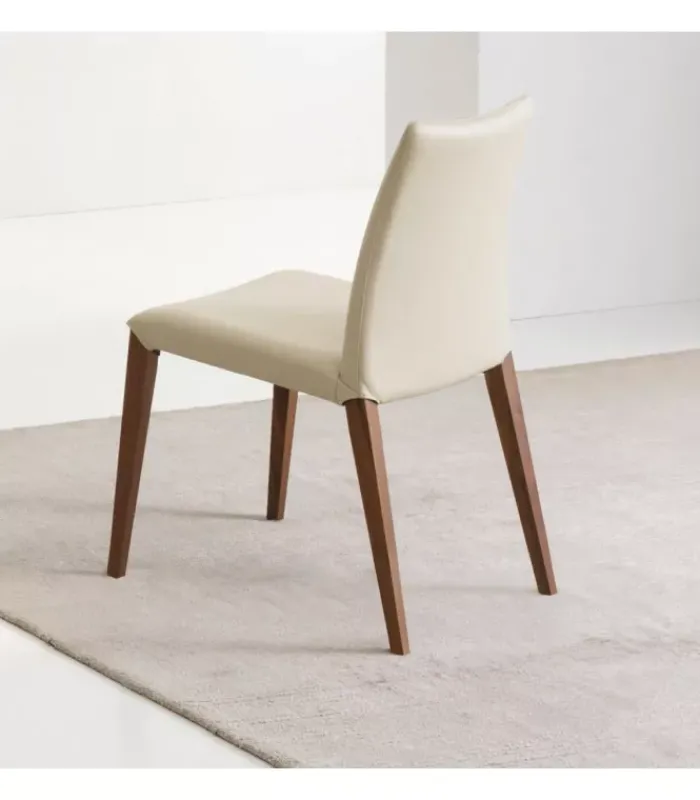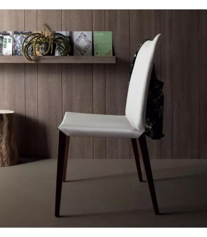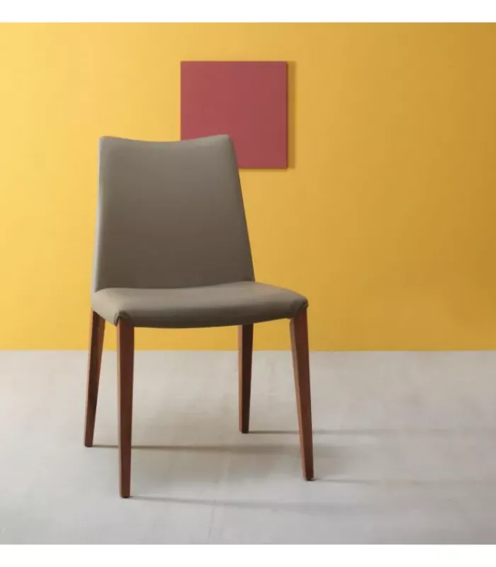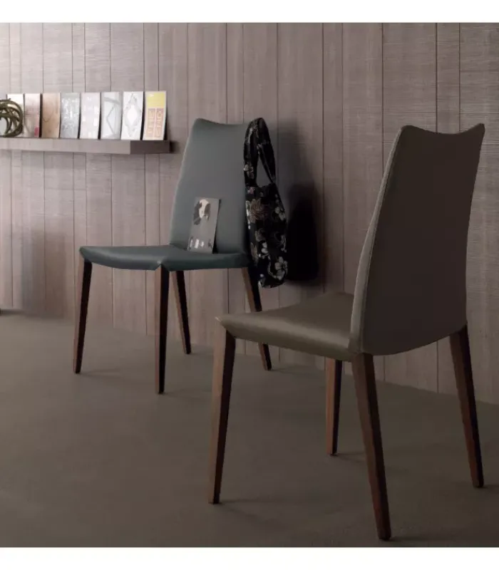 Sedia con gambe in legno noce canaletto, rovere bruciato o rovere grigio. Seduta rivestita in: cuoio rigenerato bianco, grigio lava, testa di moro, caffè, grigio antracite o grigio acciaio; ecopelle bianca, argilla, testa di moro, grigio acciaio o grigio cenere; pelle fucsia, giallo ocra, porpora, bianco, cipria, grigio perla, marmotta o camoscio.