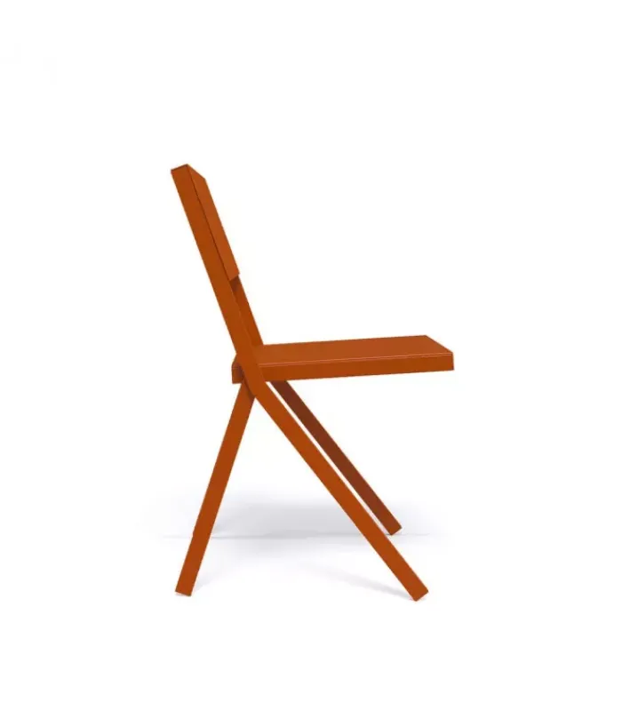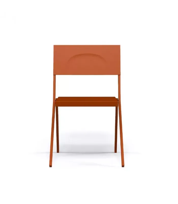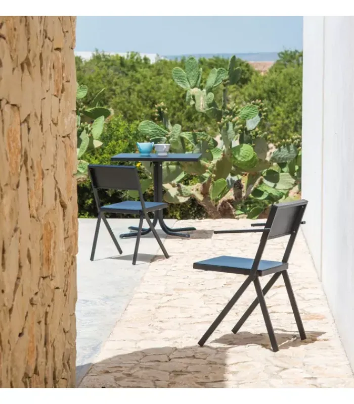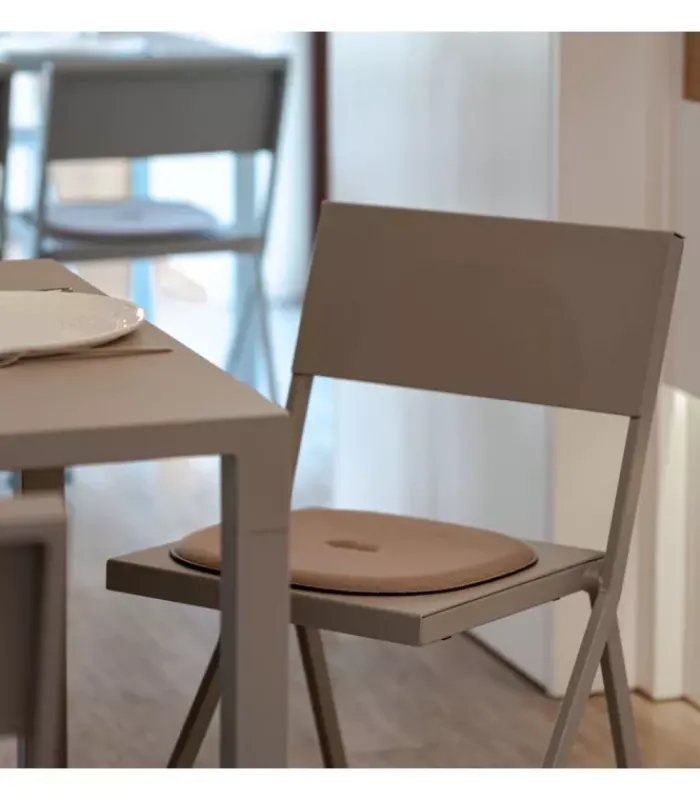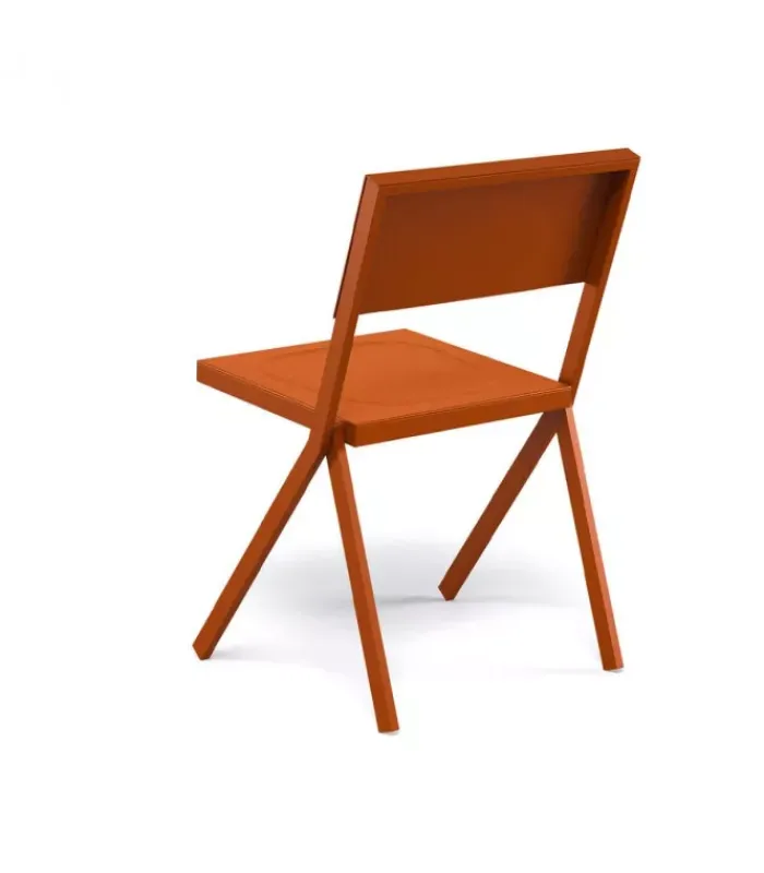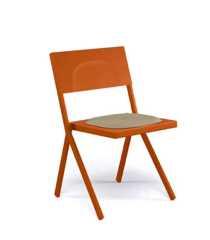 Sedia con struttura in acciaio verniciato e seduta in alluminio verniciato. È disponibile con o senza braccioli ed è accessoriabile di cuscino. È impilabile (per un massimo di 10 sedie impilate) ed è venduta in stock da 4 pezzi.