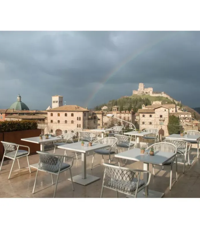 Sedia con struttura in alluminio verniciato e schienale in corda sintetica. È accessoriabile di cuscino per la seduta e lo schienale. Scegli tu l’abbinamento di colore che preferisci tra i tre disponibili. È venduta in stock da due pezzi.