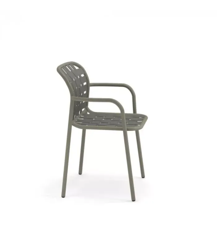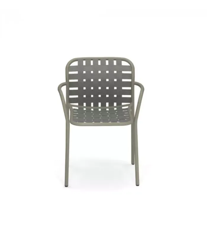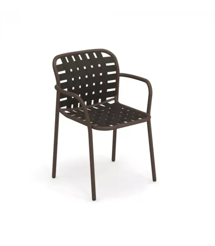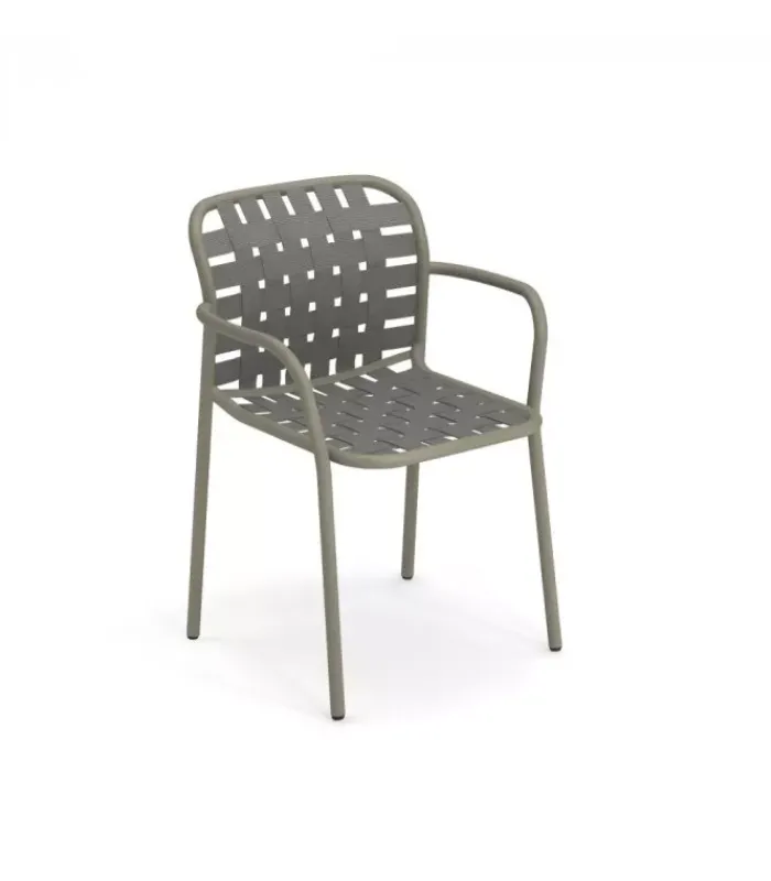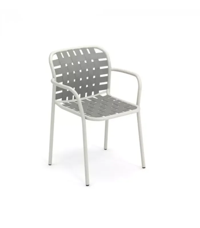 Sedia con struttura (con braccioli) in alluminio verniciato, lo schienale e la seduta sono in cinghie elastiche. È disponibile in cinque abbinamenti di colori diversi ed è impilabile (per un massimo di 4 sedie impilate). È venduta in stock da 4 sedie.