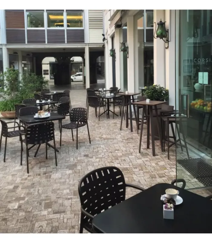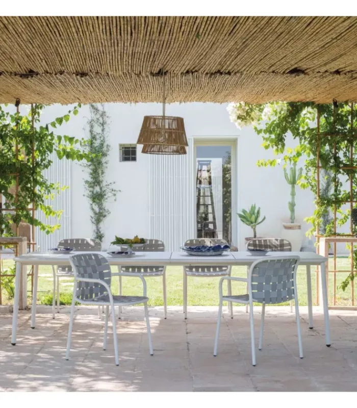 L’intreccio di cinghie elastiche, accoppiate in modo innovativo alla struttura in alluminio dalle linee sofisticate, dá vita ad un insieme dallo stile insolito ed eclettico e dal comfort accentuato, pienamente fruibile per uso esterno. Yard è una linea completa composta da sedia, poltroncina, tavoli fissi, poltrone relax, tavoli bassi di diverse dimensioni e lettino. Completano la collezione tavoli alti di varie misure per ambienti contract e residenziali.