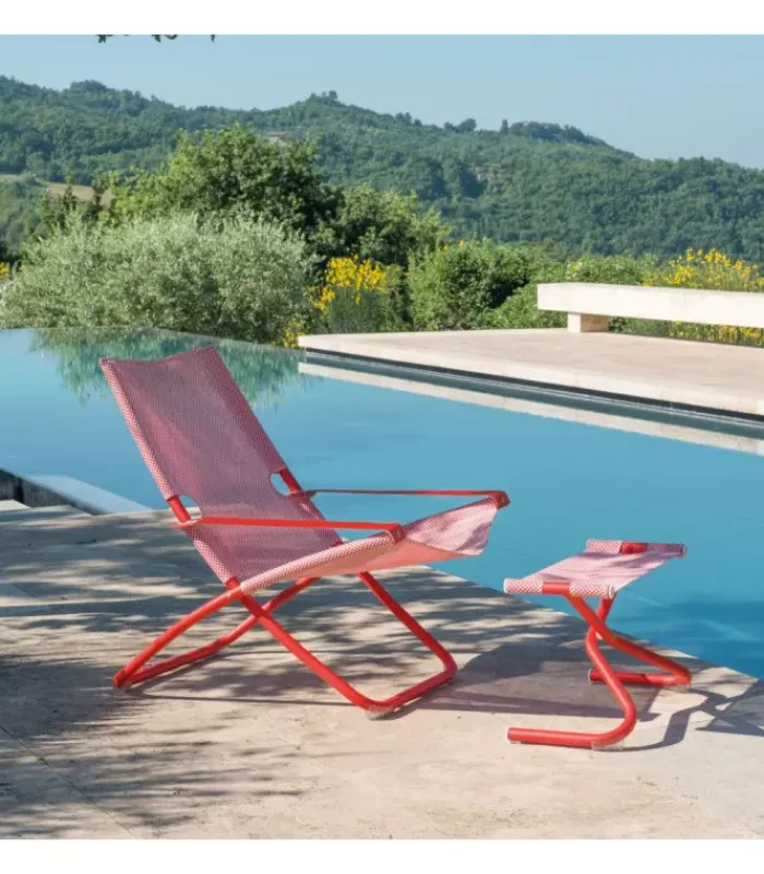 Grandi dimensioni ed una forma sinuosa ed avvolgente: queste le caratteristiche di Snooze. La struttura è realizzata in tubolare di acciaio, disponibile in diverse colorazioni abbinate a varianti di tessuto. Tutti i componenti in metallo sono isolati tra loro con elementi in plastica. Attraverso un semplice ma originale meccanismo di regolazione del bracciolo, la seduta può assumere due posizioni: la prima per la lettura, la seconda per il riposo. La collezione si compone di: sdraio, sedia regista, poggiapiedi e lettino impilabile. La nuova sdraio Cozy, pensata per uso sia indoor sia outdoor, è in maglia sintetica e microfibra.