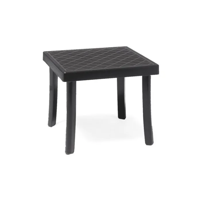 RODI, tavolino quadrato impilabile 46 x 46 cm, alto 40 cm, in polipropilene, smontabile, con 4 gambe tubolari e piedini antisivolo. Si accosta perfettamente ai lettini ed alle multiposizioni.