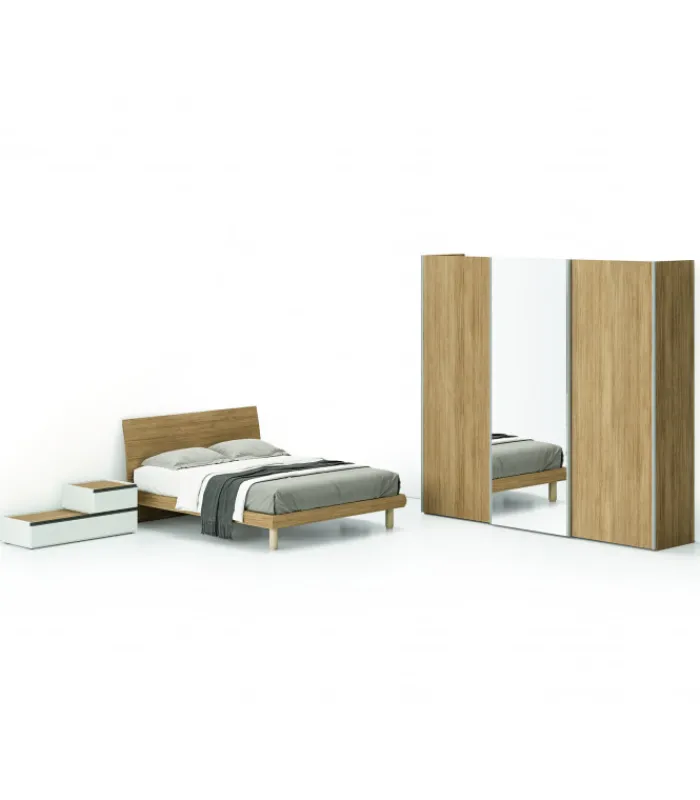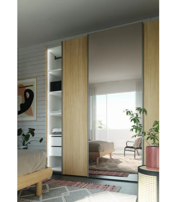 ARMADIO SNOW : Armadio scorrevole a tre ante dal design essenziale, disponibile in diverse combinazioni per una grande versatilità. L’anta a specchio ha il merito di far apparire la camera più grande e luminosa. L’accostamento tra matericità diverse, come l’essenza affiancata a una superficie specchiata, permette di vivere in una zona notte sempre unica e dal tratto personale.