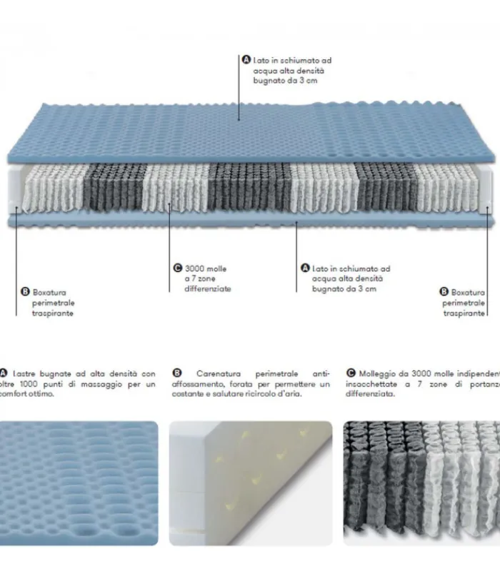 Materassi studiati per coloro che pretendono il massimo per il loro comfort e per il loro benessere. Questa lavorazione prevede che ogni molla risponda autonomamente alle sollecitazioni esercitate dal corpo assicurando un sostegno differenziato per ogni zona ed un’ergonomia di altissimo livello. Le varie lavorazioni con molleggi tutti differenziati per composizione, struttura e caratteristiche e la possibilità di personalizzare il prodotto con il memory form e le fodere lavabili, danno l’opportunità di una scelta amplissima per soddisfare ogni esigenza ed ogni richiesta. Il tutto sempre grazie al lavoro manifatturiero, fiore all’occhiello dal Made in Italy e di Albiflex.