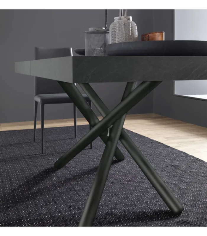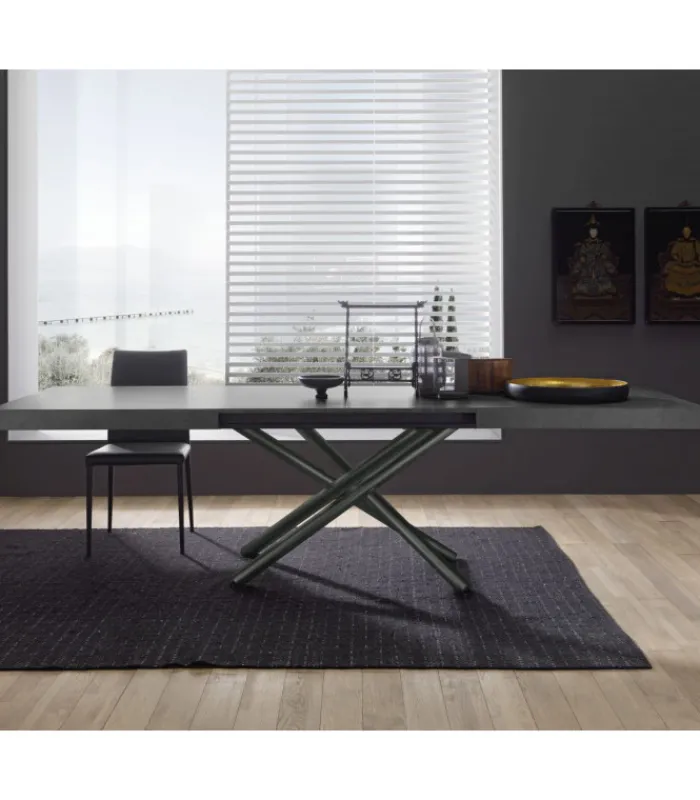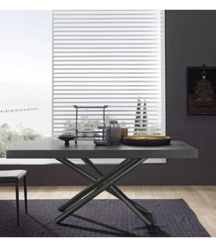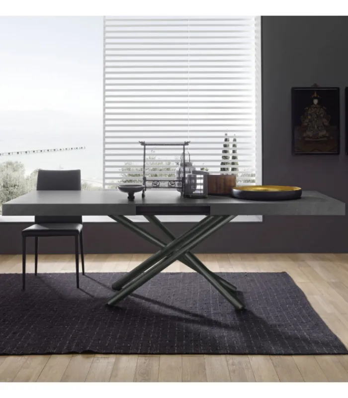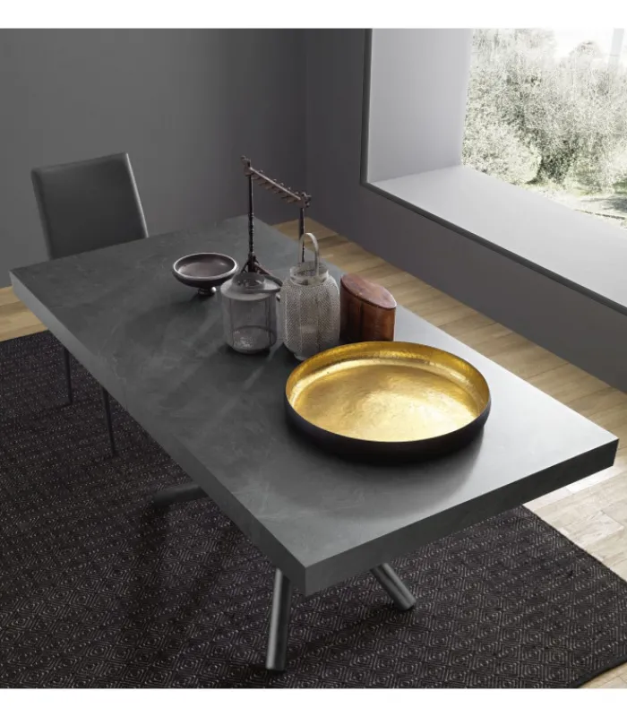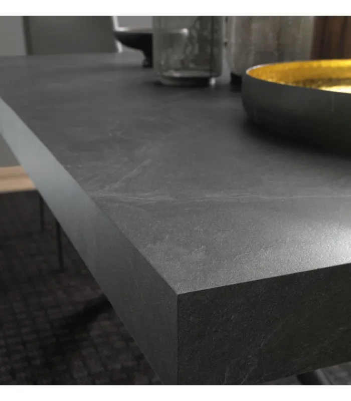 Tavolo da pranzo fisso o allungabile, struttura in metallo, piano in nobilitato, legno o effetto malta. Allungabile: apertura sincronizzata con 2 prolunghe interne. Spessore piano nobilitato o effetto malta: cm 8. Spessore piano legno bordo dritto: cm 8.