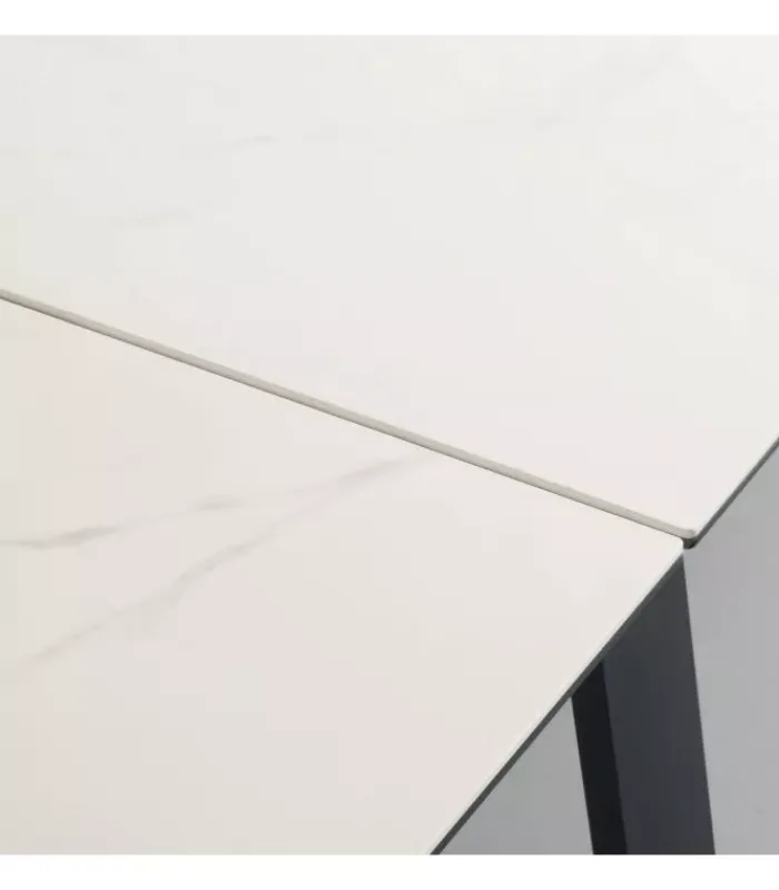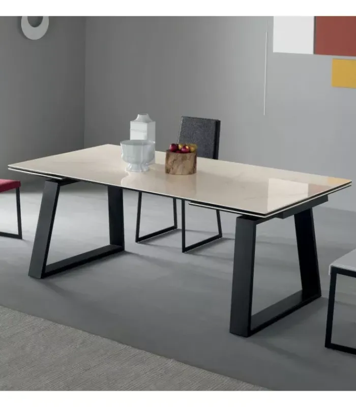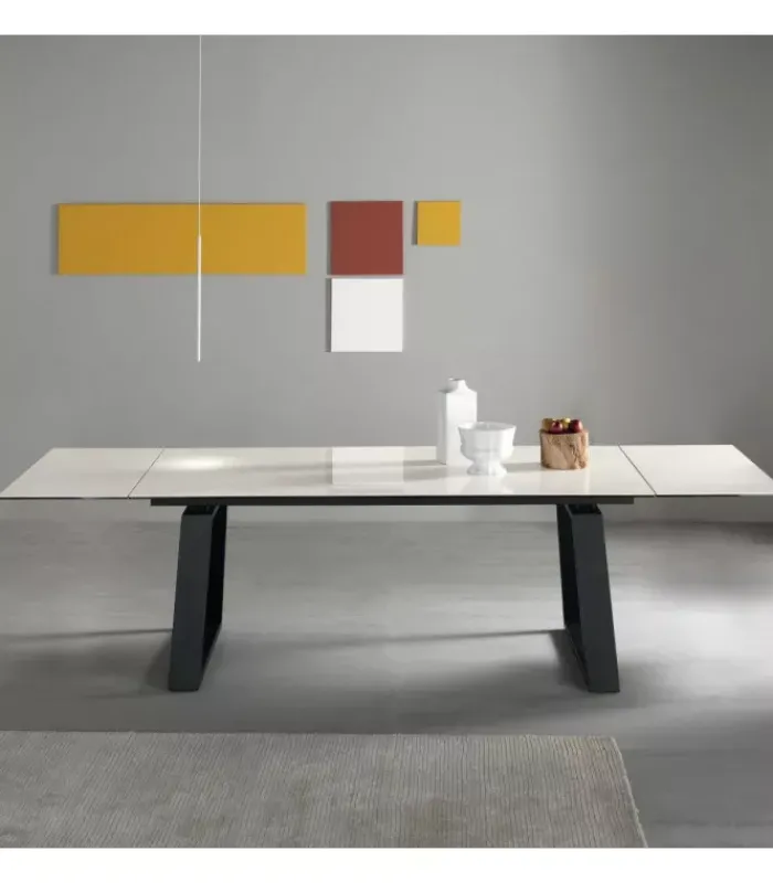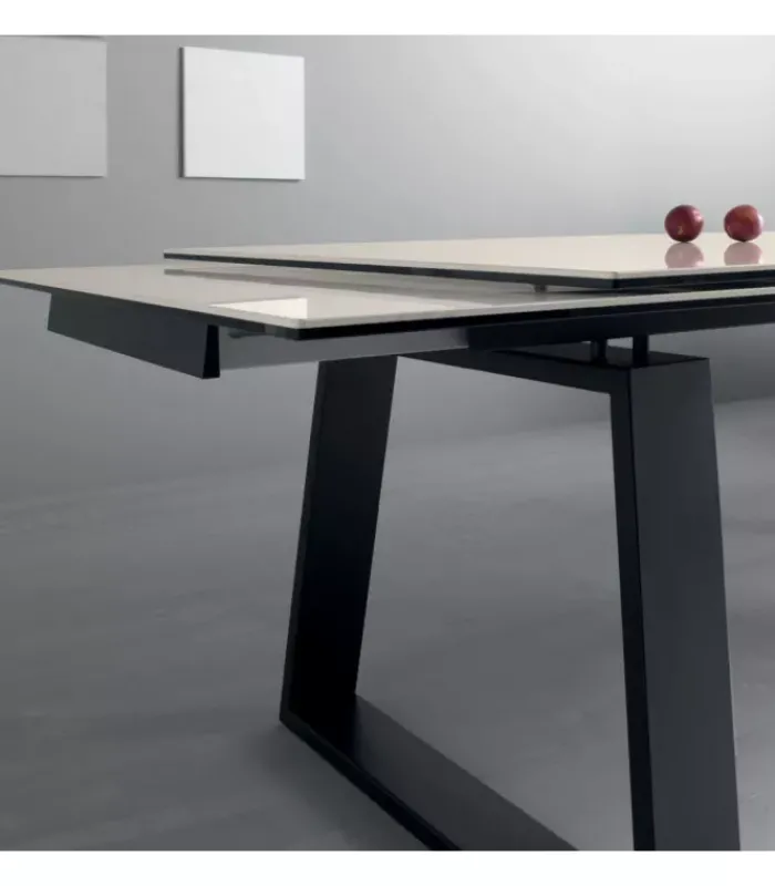 Tavolo allungabile con gambe trapezoidali in metallo verniciato a polvere. Telaio allungabile in alluminio con 2 allunghe. Piano in ceramica. Il tavolo allungabile Mango ha due elementi d’appoggio a terra fissi. Il contrasto tra la base e il piano è evidente soprattutto nelle finiture. L’etereo spessore del piano in ceramica sembra levitare sopra alla robusta base in metallo.