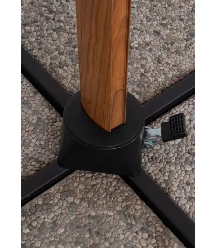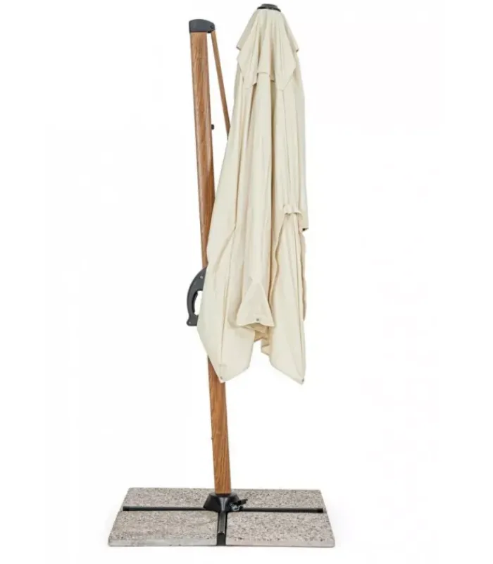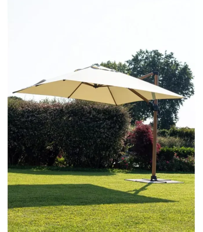 STRUTTURA IN ALLUMINIO VERNICIATA A POLVERE (POLIESTERE) EFFETTO LEGNO. PALO 80X53MM. 8 STECCHE 24X14MM. TELO BEIGE IN POLIESTERE 250GR/M2 CON RIVESTIMENTO IN PA (POLIAMMIDE) CON CAMINO ANTIVENTO. BASE A CROCE IN ACCIAIO. PALO GIREVOLE 360° CON PEDALINA. INCLINAZIONE VERTICALE CON IMPUGNATURA A 4 POSIZIONI. DOTATO DI MANIGLIA PER INCLINAZIONE OMBRELLO DESTRA-SINISTRA. COMPRENSIVO DI COPRIOMBRELLONE. MARMETTE NON INCLUSE. PREDISPOSIZIONE LAMPADA LED COD. 0795364 E SPEAKER COD. 0795365. – DIMENSIONI IN CM. 300 (L.) 200 (P.) 260 H