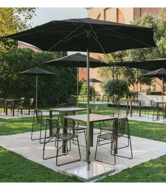 Riviera, disegnate da Lucidi/Pevere, è composta da sedia, poltroncina, lounge e sgabello; caratteristica principale è segno grafico minimale e raffinato; la struttura interamente saldata, è realizzata in tubolare e barre con profilo arrotondato (a mezza mandorla) di acciaio Fe360. Rivestimento in Emu-Coat (cataforesi + verniciatura).