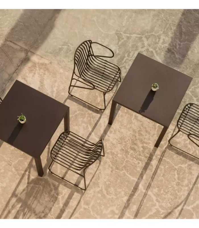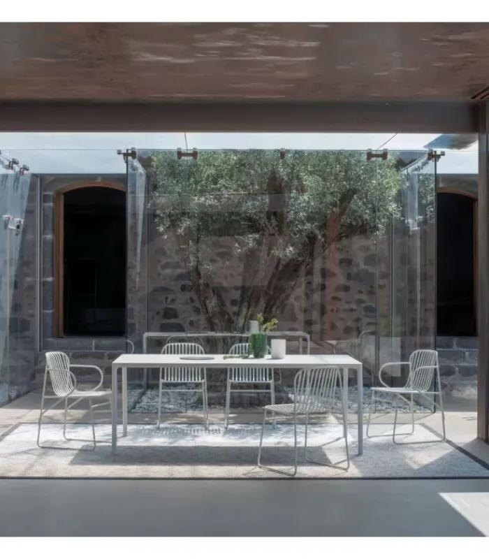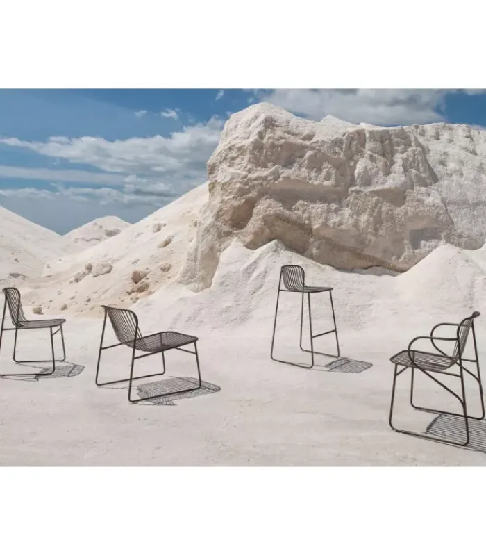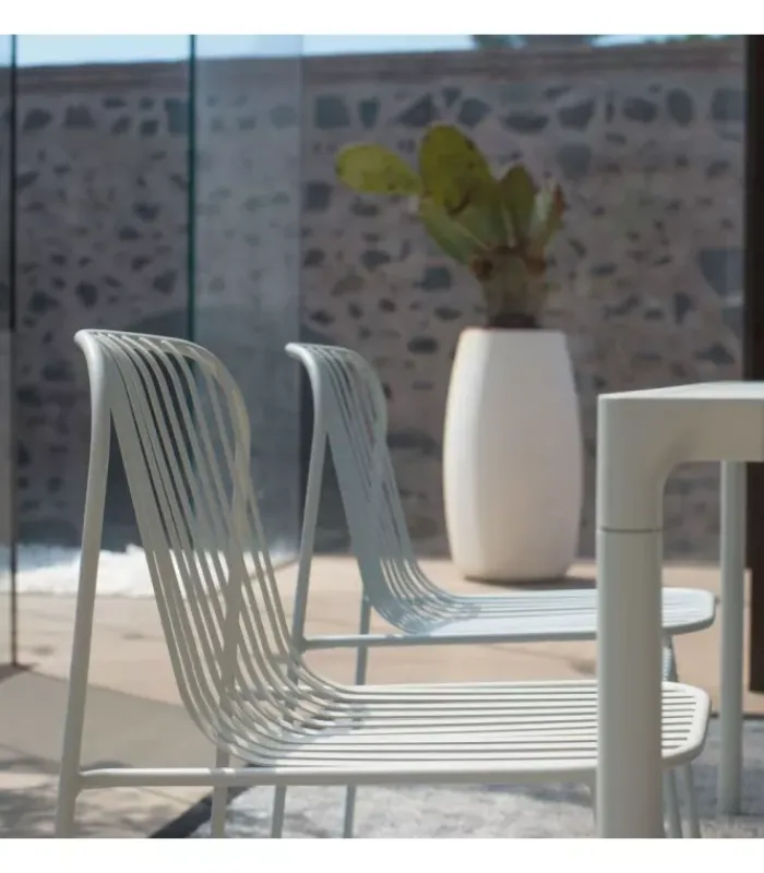 Sedia con seduta e struttura in acciaio verniciato. È disponibile nella versione con o senza braccioli ed in moltissimi colori diversi. È impilabile (per un massimo di 8 sedie impilate) ed è venduta in stock da 4 sedie.