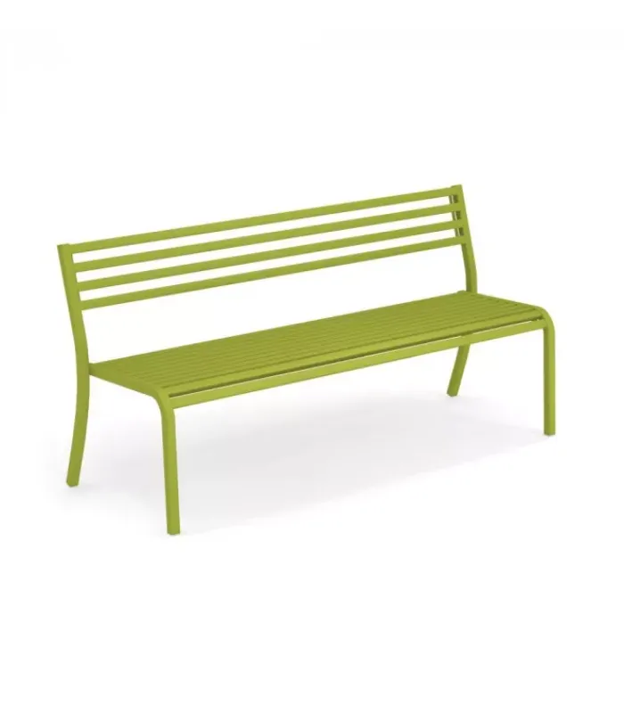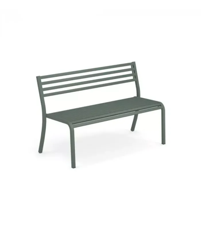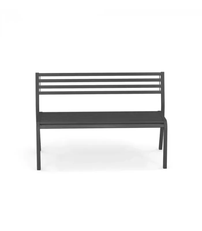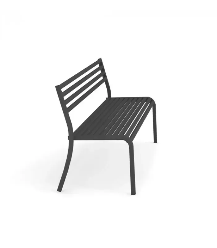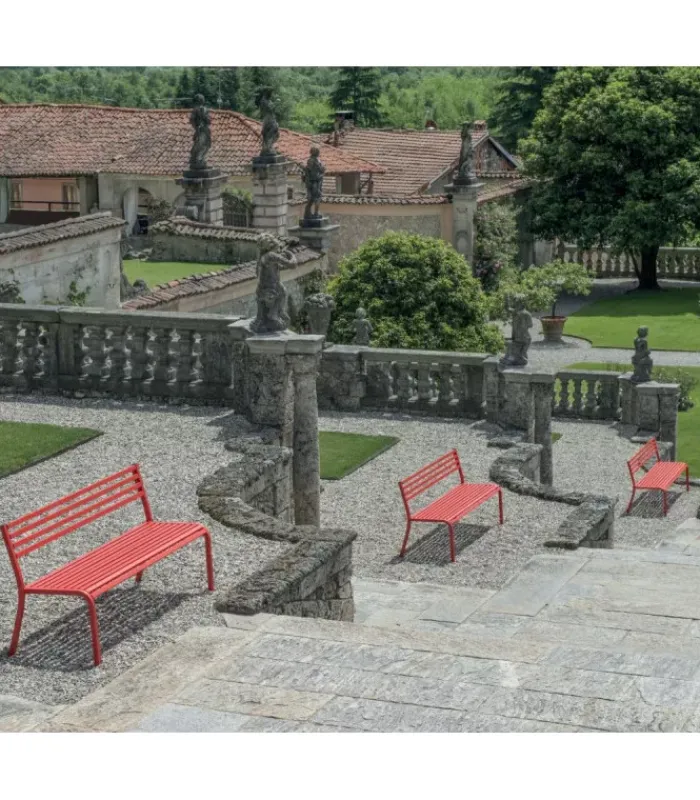 Panca con struttura in acciaio verniciato, la seduta e lo schienale sono in lamiera pre zincata a caldo e verniciata. È disponibile in nove colori diversi ed è impilabile (per un massimo di 4 panche impilate).