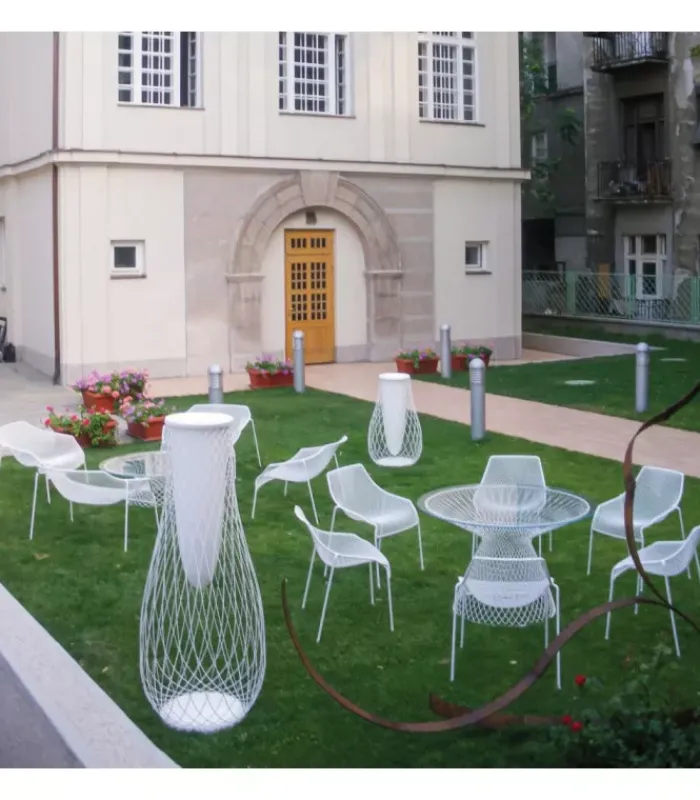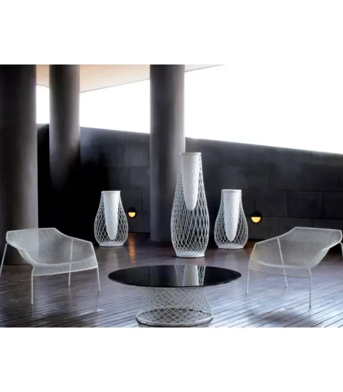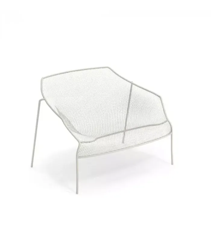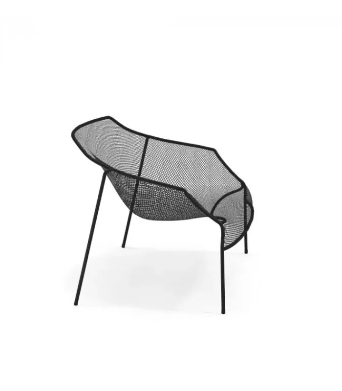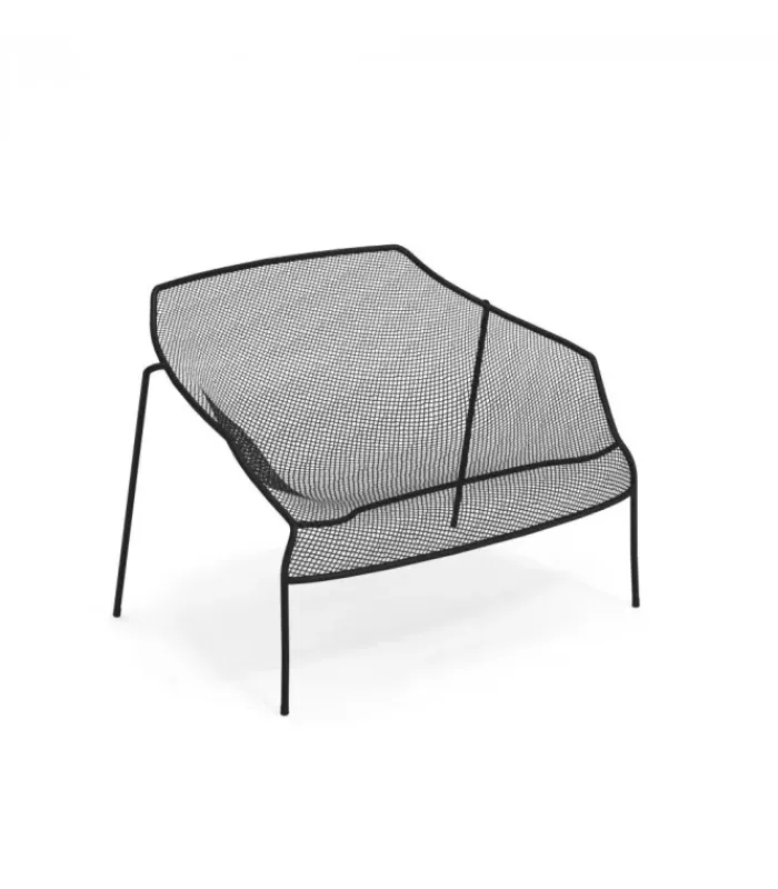 Poltrona con struttura in acciaio verniciato, la seduta e lo schienale sono in rete di acciaio intrecciata, pre zincata a caldo e verniciata. È venduta in stock da 2 pezzi ed è impilabile (per un massimo di 4 poltrone impilate).