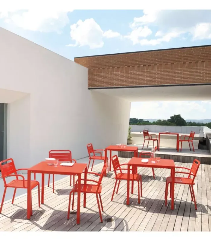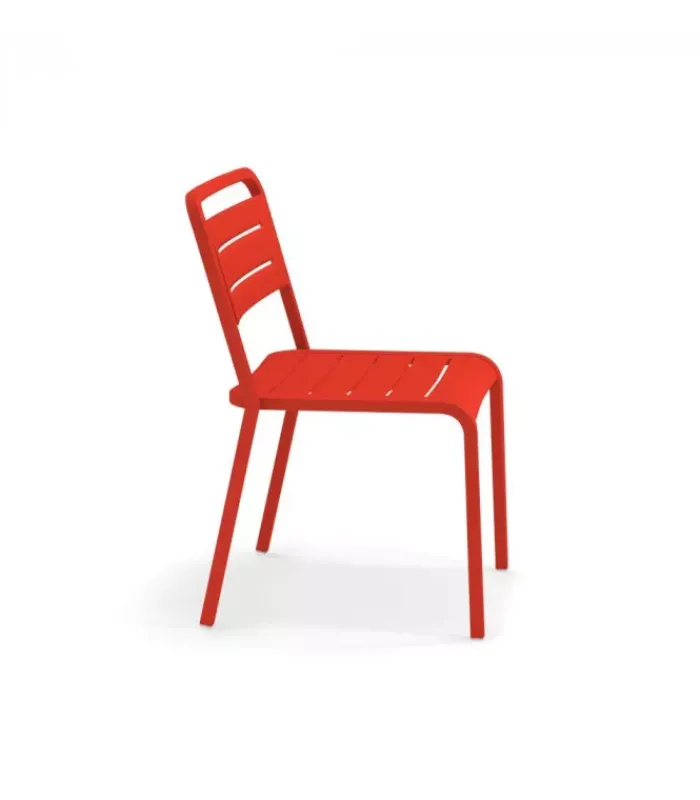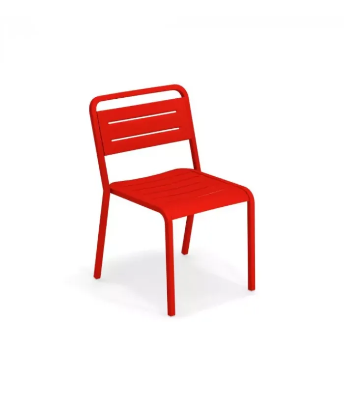 Sedia con struttura (con o senza braccioli) e seduta in alluminio verniciato. È disponibile in undici colori diversi ed è accessoriabile di cuscino. È impilabile (per un massimo di 8 sedie impilate) ed è venduta in stock da 4 sedie.