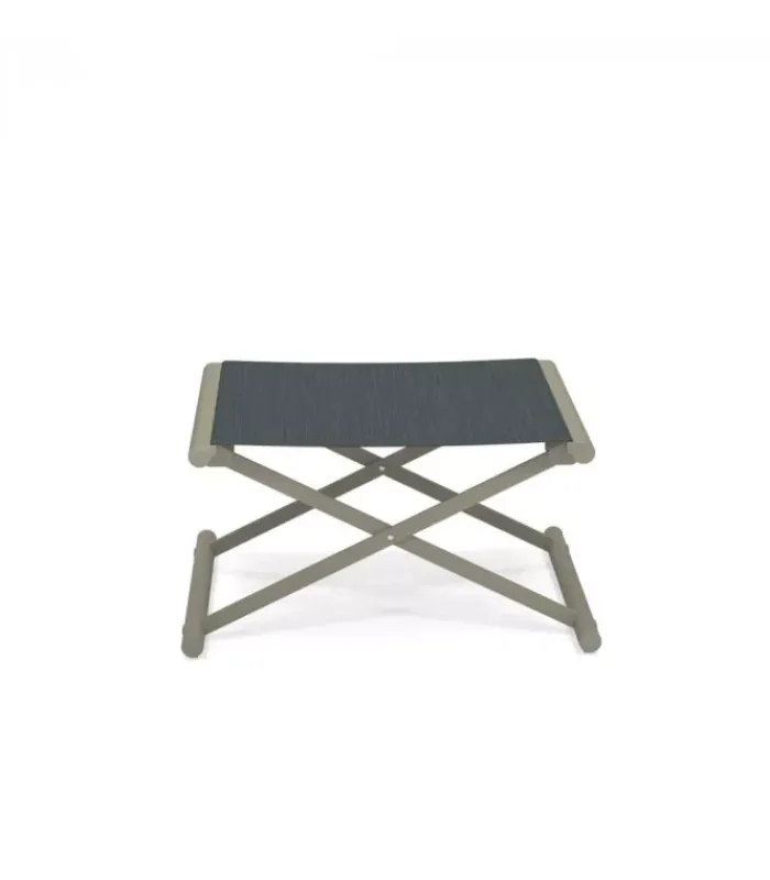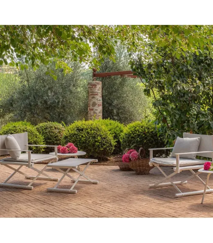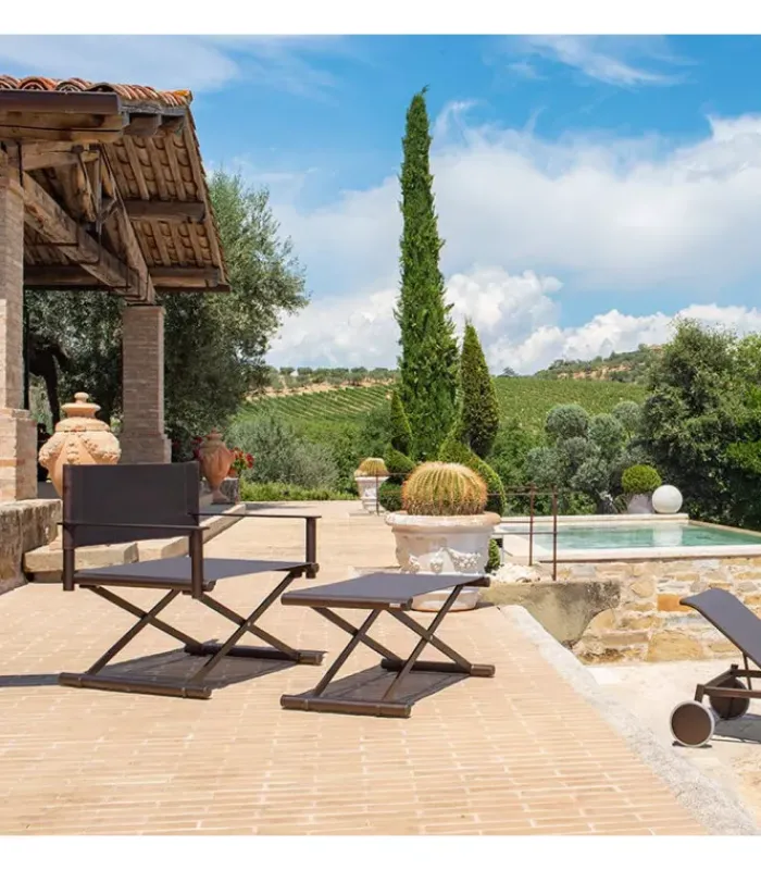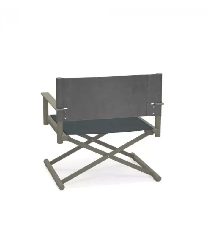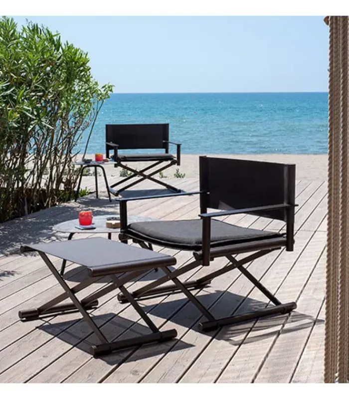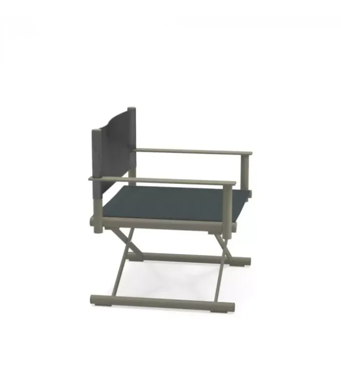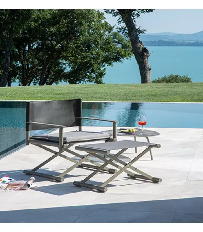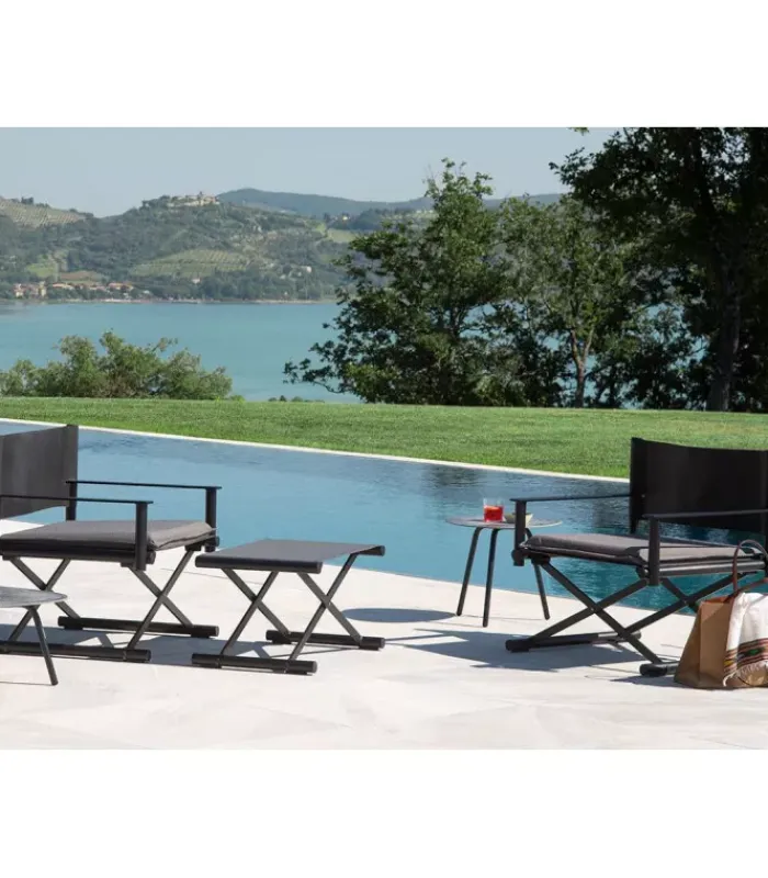Sedia da regista con struttura in alluminio, lo schienale è in eco-cuoio e la seduta in emu-tex. La seduta è accessoriabile di cuscino. È disponibile in diversi colori. È abbinabile a un poggiapiedi.