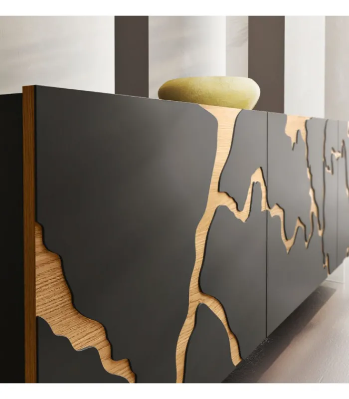 Design unico con intarsio in legno vero: Le ante della madia sono arricchite da un intarsio in legno vero, che dona al mobile un carattere distintivo e una bellezza senza tempo, rendendolo un pezzo esclusivo nel tuo soggiorno.
