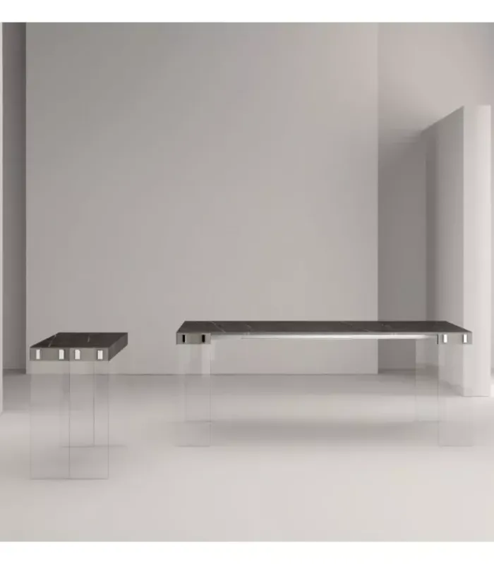 - Gambe in vetro trasparente che conferiscono leggerezza e un tocco di modernità.