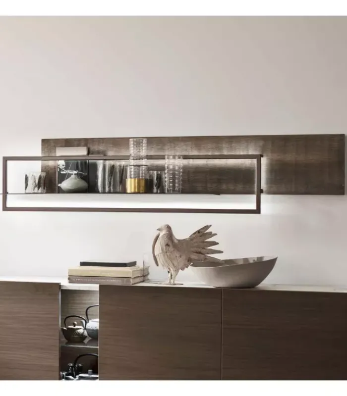 Una mensola formata da un piano di appoggio, una cornice decorativa in metallo e uno schienale personalizzabile in diverse finiture e più colori. La luce integrata mette ulteriormente in risalto il design.