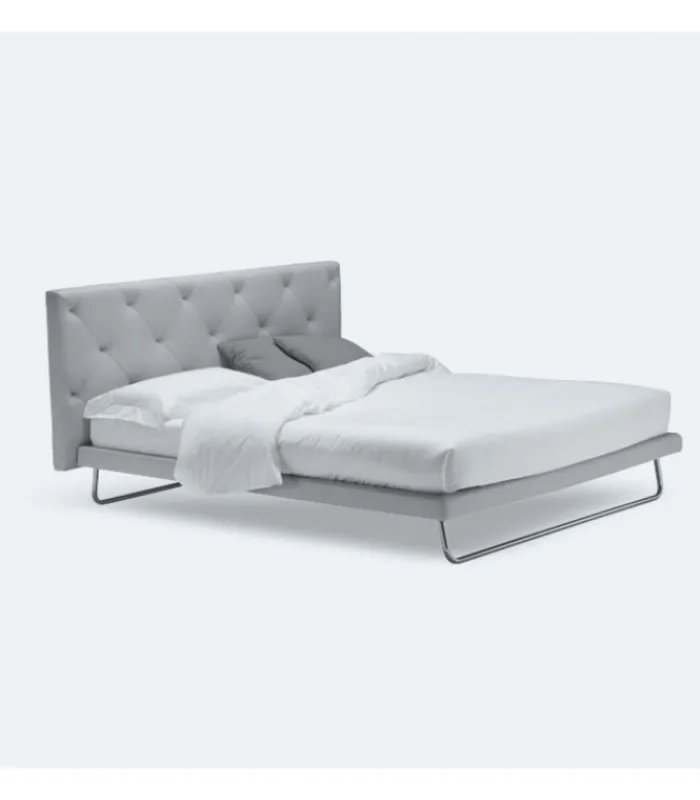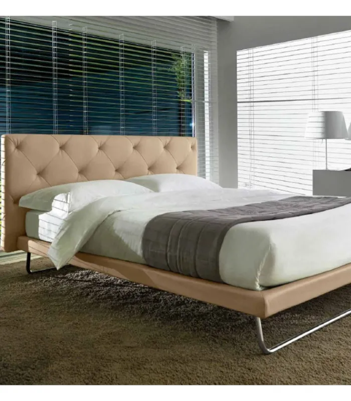 Letto GURU H10 imbottito e rivestito in pelle, ecopelle o tessuti antimacchia (non è sfoderabile). I piedini sono a slitta, cromati o verniciati di bianco, la rete inclusa è ortopedica con 14 doghe di 6,5 centimetri l’una, sorrette da un doppio palo centrale. È disponibile in 5 diverse larghezze e 2 diverse lunghezze.