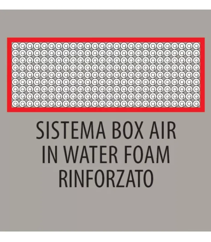 il sistema BOX AIR è una struttura perimetrale in Water Foam ad alta densità, di larghezza variabile, che contiene il molleggio. BOX AIR garantisce robustezza e indeformabilità al materasso, mantenendo le caratteristiche di sostegno anche quando ci si siede sul bordo del materasso.