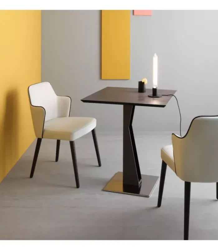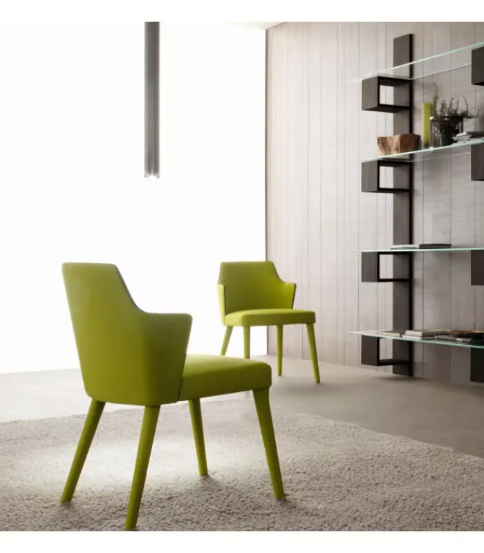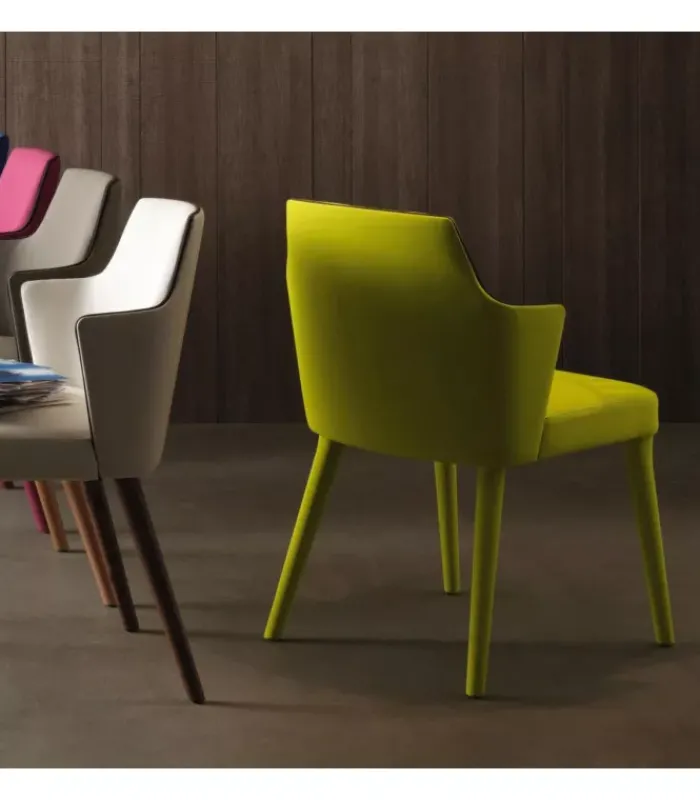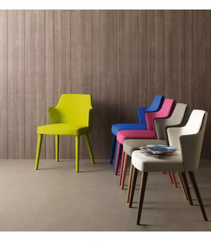Poltroncina con struttura in legno, disponibile anche rivestita dello stesso materiale e dello stesso colore della seduta. Le cuciture sono in tinta, il profilo in ecopelle.