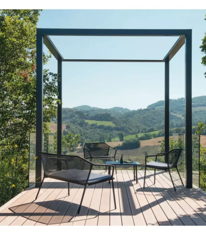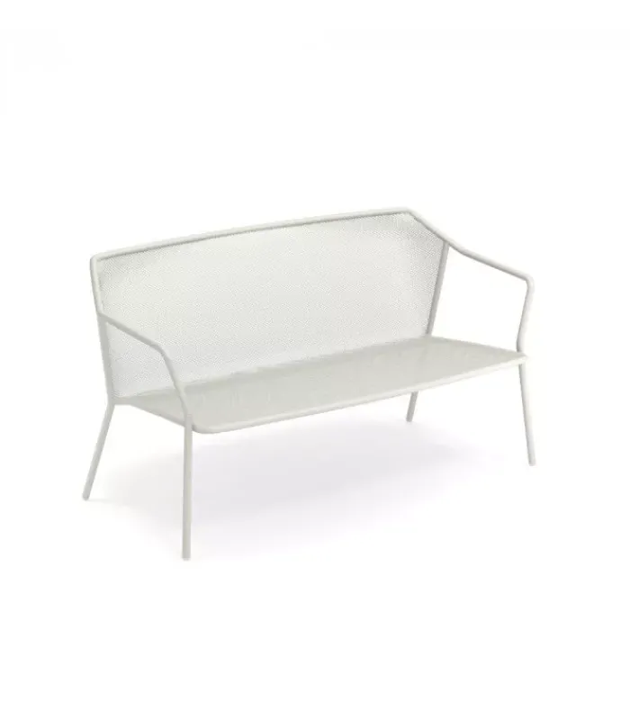 Divano con struttura in acciaio verniciato, la seduta e lo schienale sono in lamiera stirata pre zincata a caldo e verniciata. È accessoriabile di cuscino per la seduta, disponibile in diversi colori.