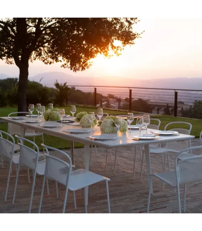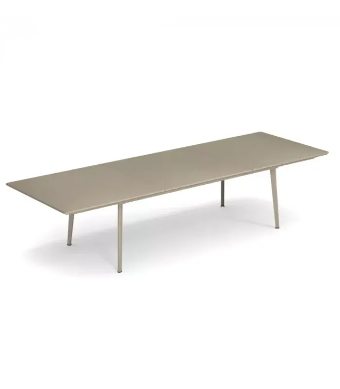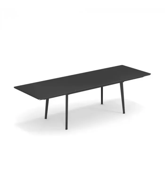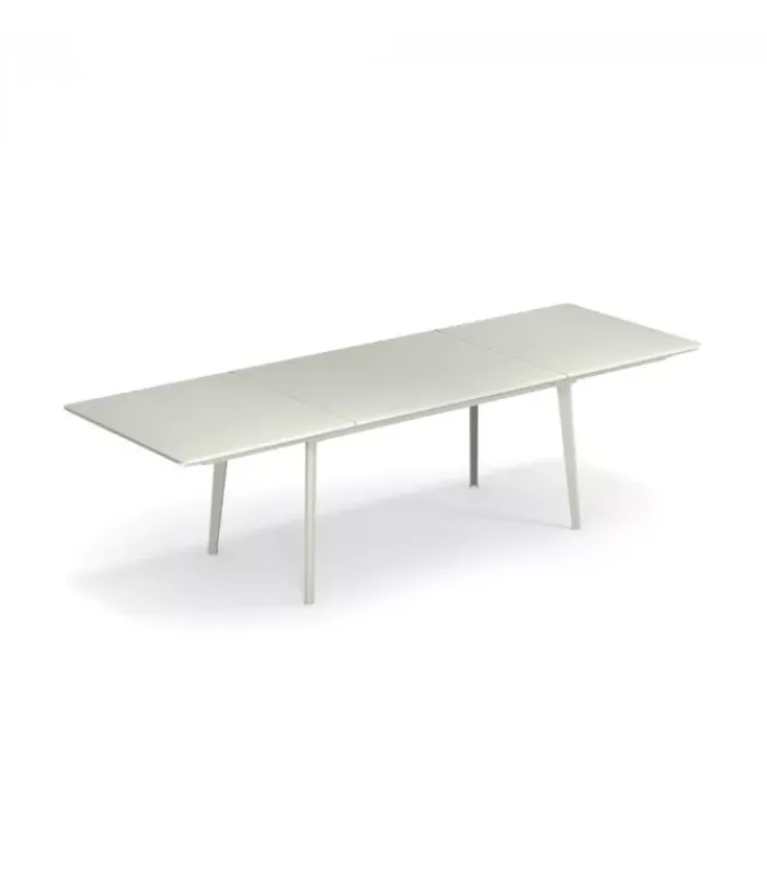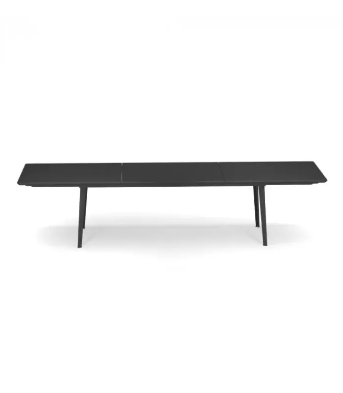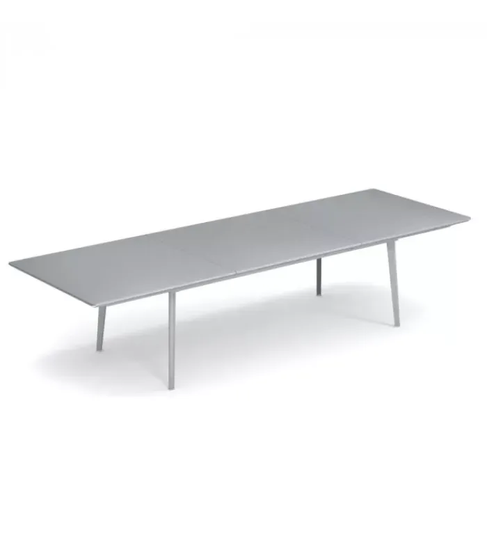 La collezione Plus4 si compone di un tavolo allungabile da 160+110×90 cm, uno da 220+110×90 cm, i nuovi tavoli Balcony e Imperial Plus4. Il piano è in acciaio pressopiegato con lavorazioni attente alle finiture per un migliore effetto estetico. Le guide utilizzate per permettere l’estensibilità del piano sono disegnate da EMU. Il meccanismo a farfalla della prolunga interna rende le operazioni di apertura estremamente pratiche. Rispetto ad un tradizionale tavolo estensibile, la prolunga di 110 cm permette di aggiungere 4 posti tavola anziché 2, aumentando le possibilità di utilizzo di questo prodotto. Inoltre l’estensione del tavolo è progettata in maniera tale che tutti i posti tavola possano essere utilizzati senza l’intralcio delle gambe.