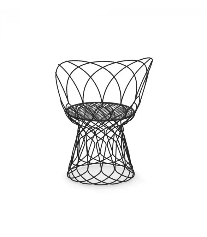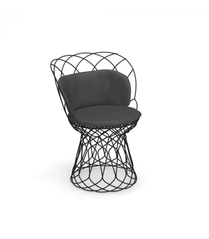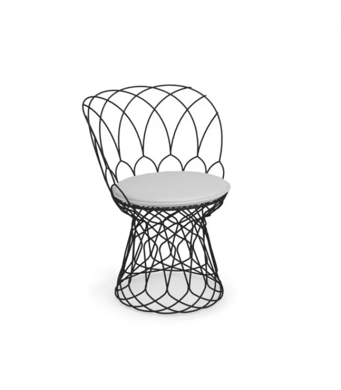 Sedia con struttura e seduta in acciaio verniciato. È accessoriabile di cuscino per la seduta e per lo schienale. È disponibile in due colori.
