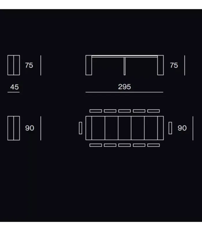 Dimensioni 45/295 x 90 x h 75 (5 allunghe da 50 cm.)