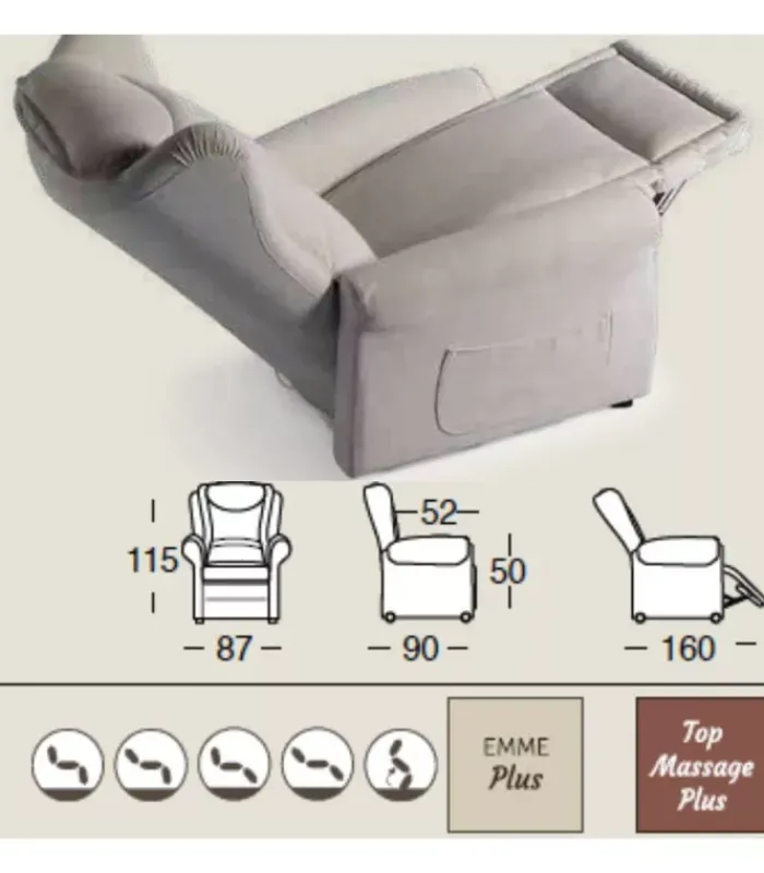TOP MASSAGE PLUS: Esegue massaggi Stretching, Kneading, Tapping ed abbina Kneading, Tapping e stretching eseguendo massaggi con azioni combinate. Questa meccanica è dotata di due motori + alzapersona (EMME PLUS). Sulla pediera viene montato un vibro-massaggiatore che favorisce la circolazione del sangue.