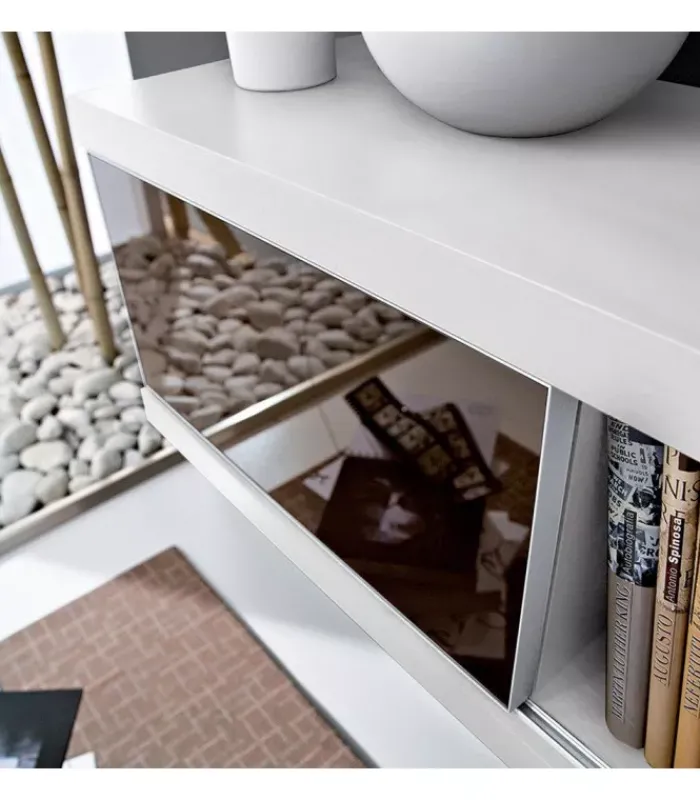 Anta con profili in alluminio anodizzato in “0” chimico (satinato) scorrevole e vetro laccato. Struttura laccata opaca.