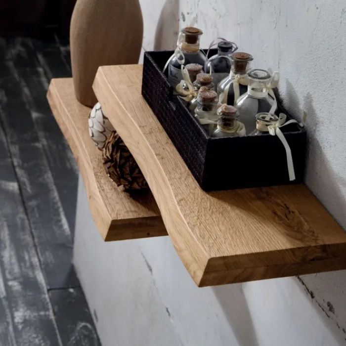 ZOE 622, composizione per ingresso a parete estremamente versatile e composta da 2 contenitori a giorno con schienale specchio o laccato e due mensole in massello di rovere.