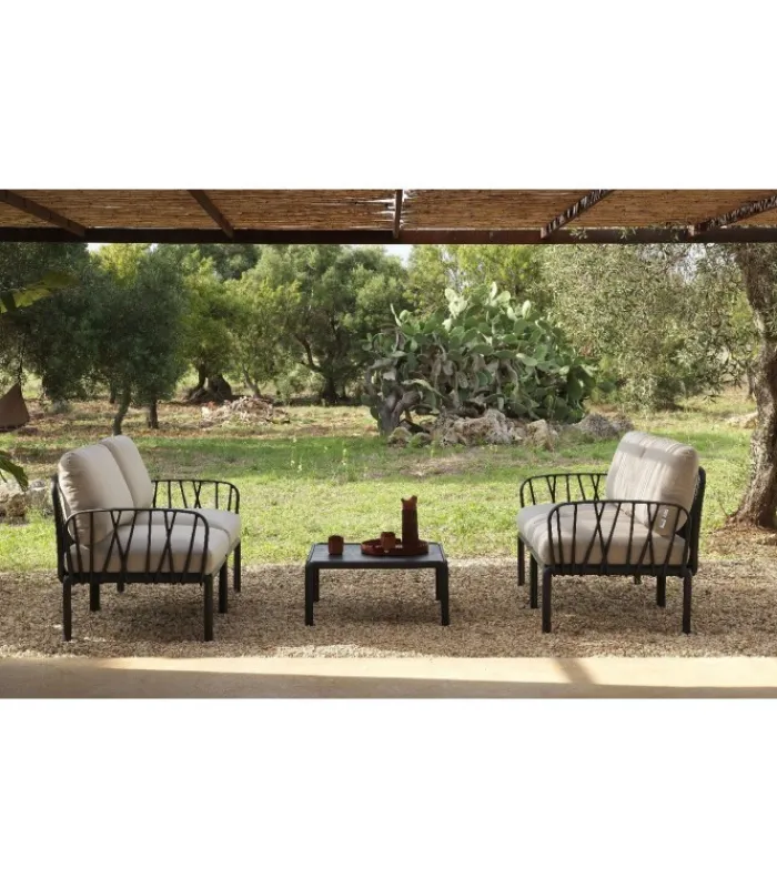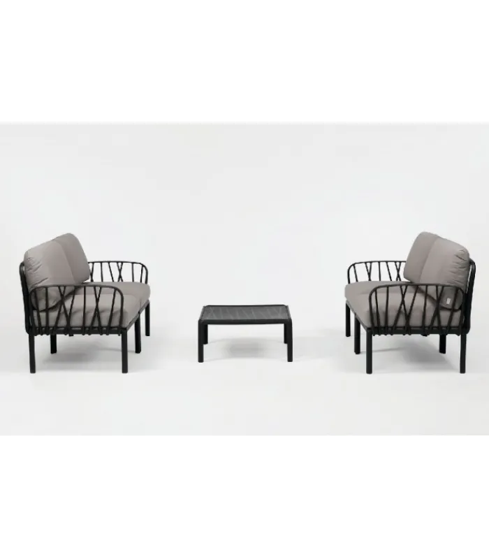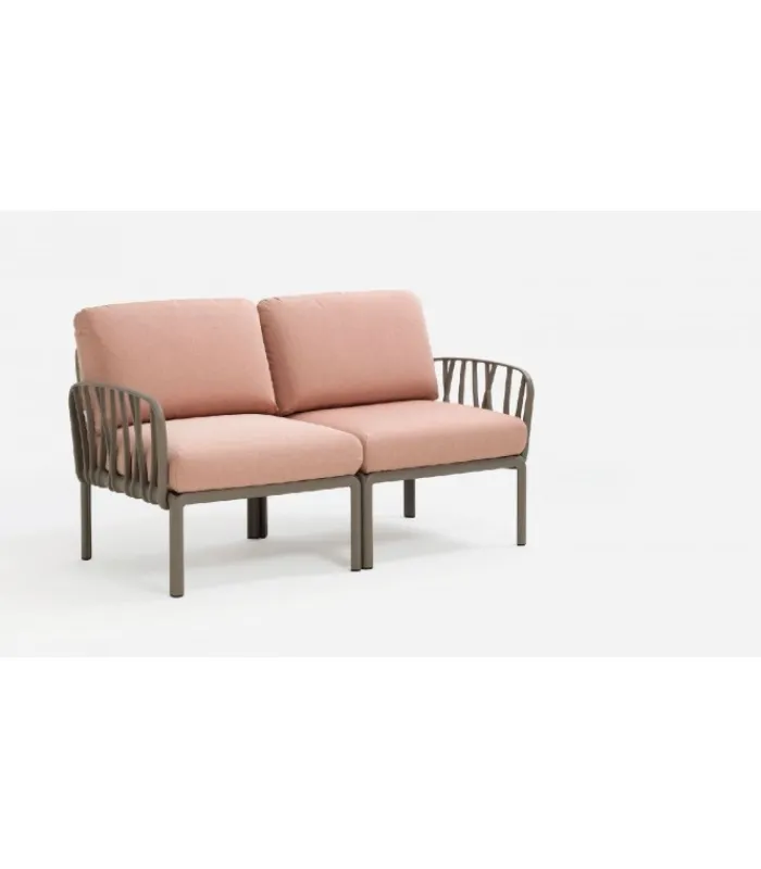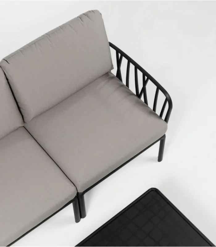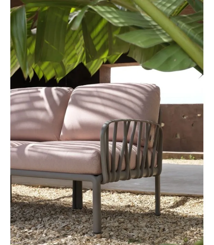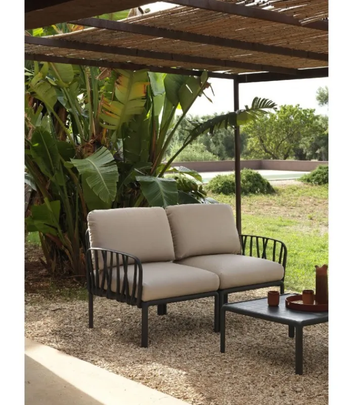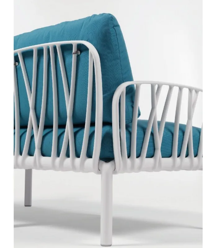 Divano KOMODO 2 POSTI fa parte della serie KOMODO di NARDI ultima novità nell’arredo giardino Made in Italy. KOMODO è un progetto di di Design a cura di Raffaello Galiotto che trae ispirazione dalla natura. La trama ramificata della struttura in polipropilene si materializza attraverso un innovativo sistema di aggancio tra i vari elementi, bracciolo, schienale, e seduta corredati da morbidi cuscini in tessuto trattati per uso esterno.