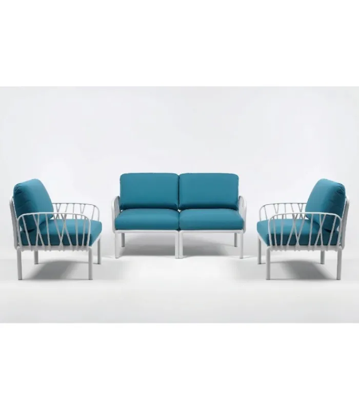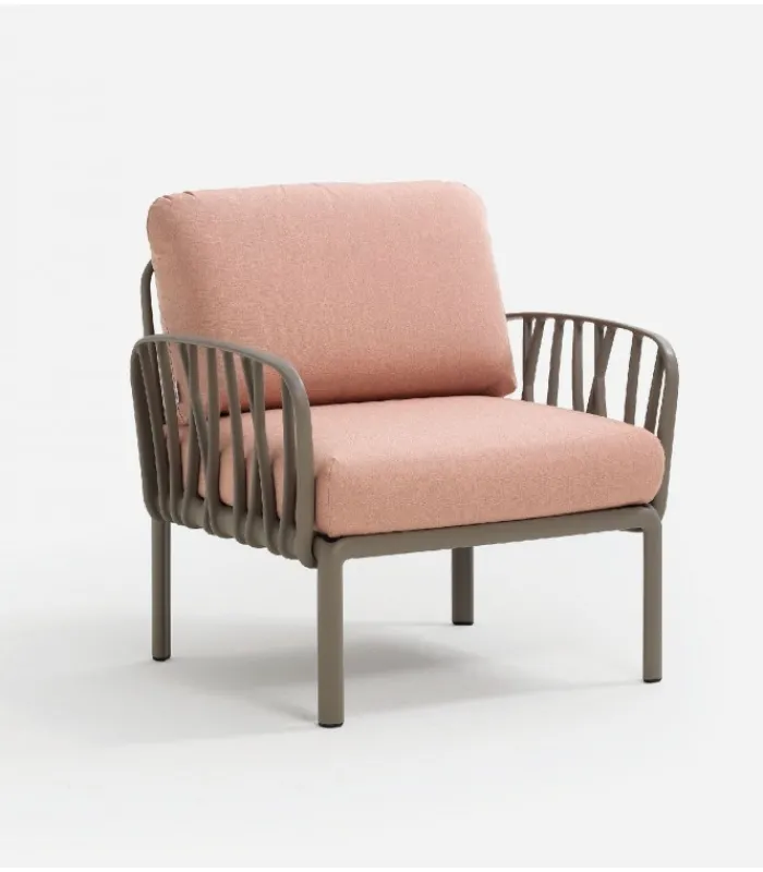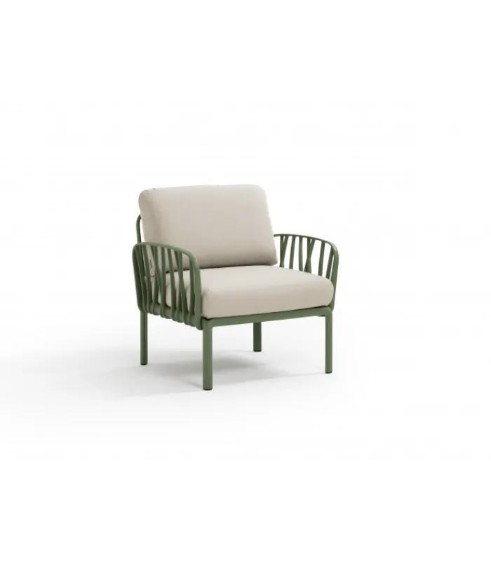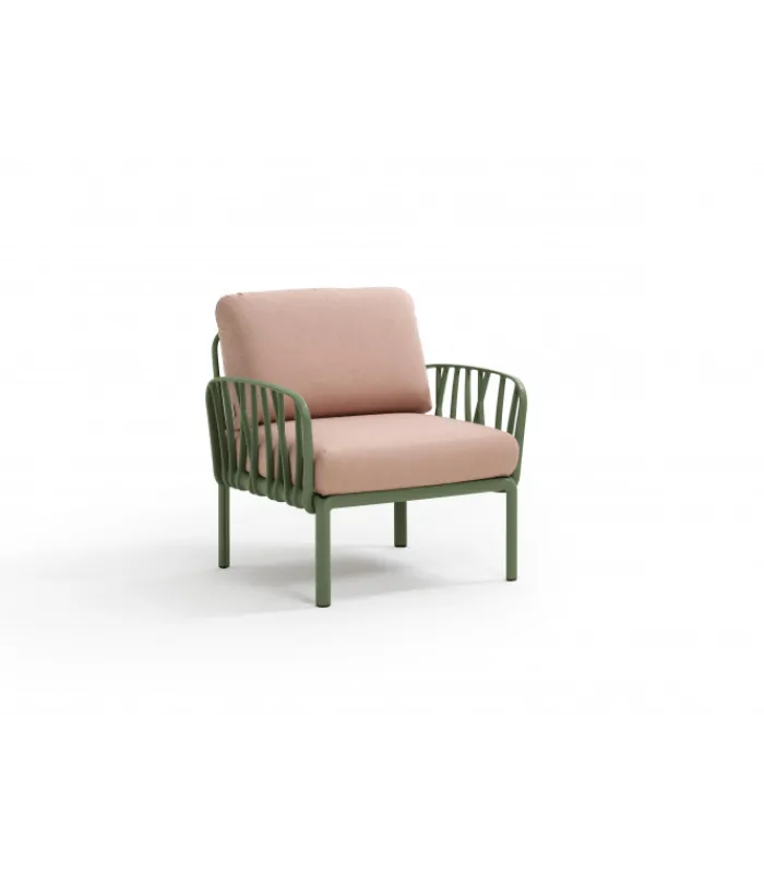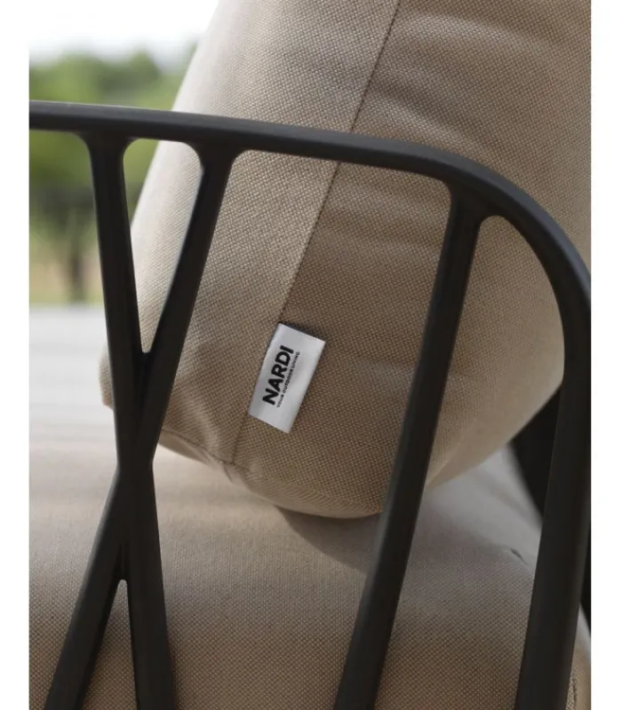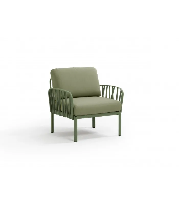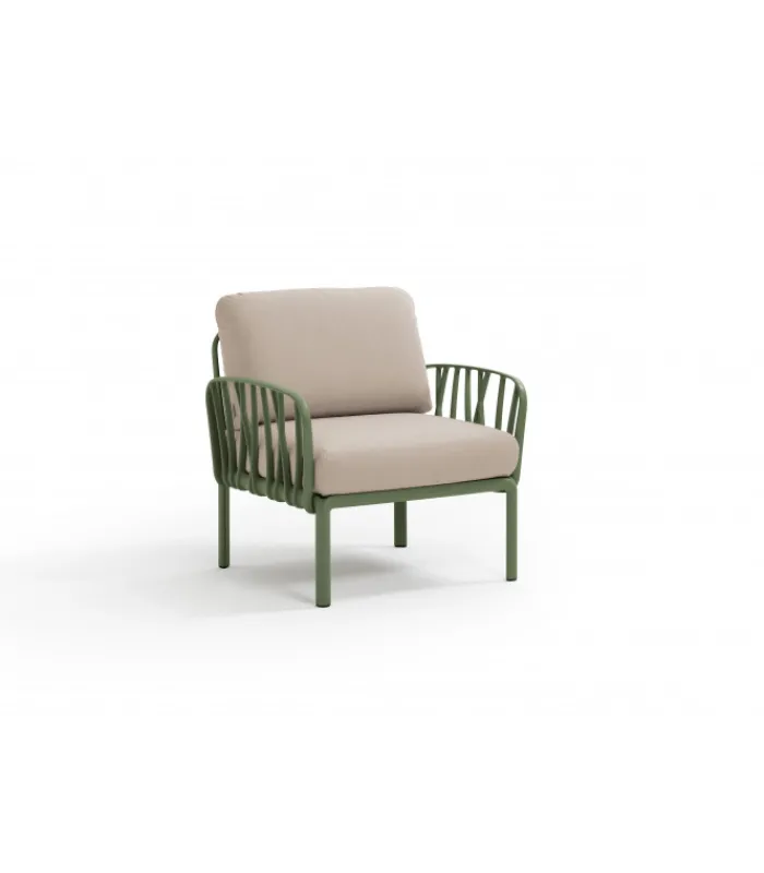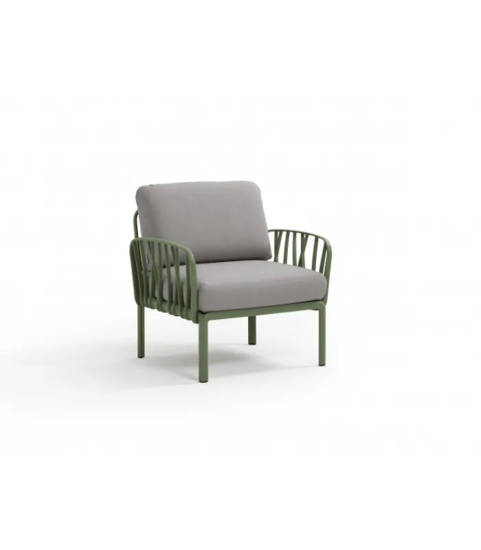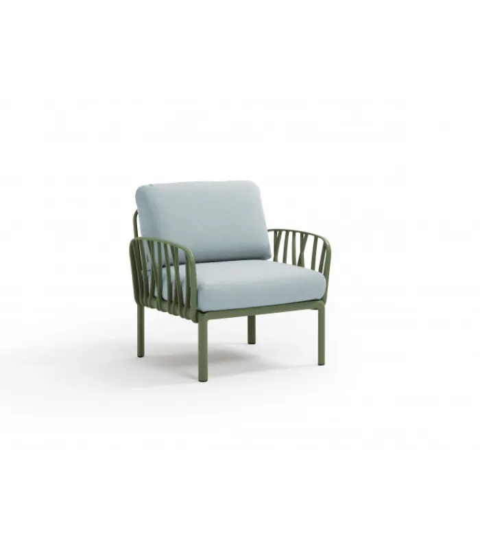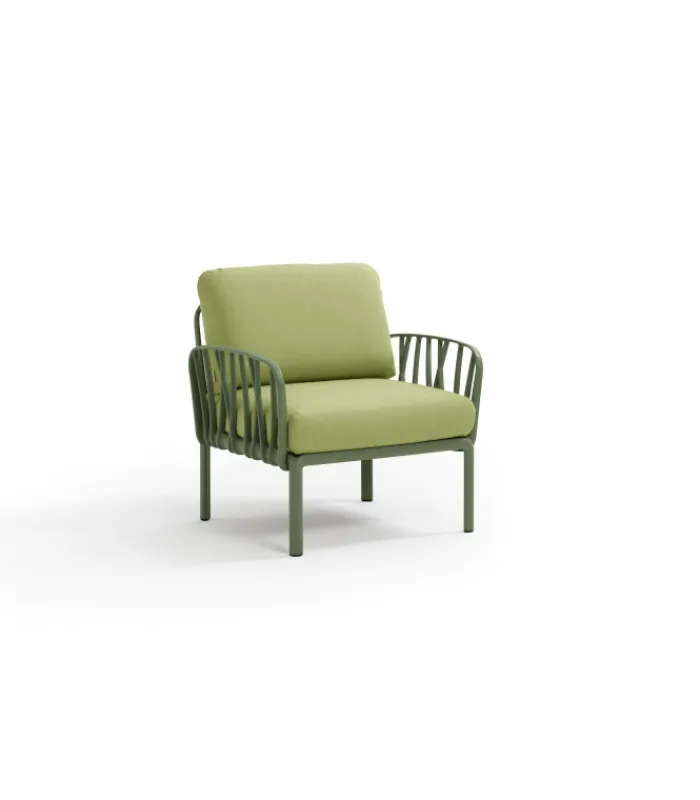 KOMODO POLTRONA fa parte della serie KOMODO di NARDI ultima novità nell’arredo giardino Made in Italy. KOMODO è un progetto di di Design a cura di Raffaello Galiotto che trae ispirazione dalla natura. La trama ramificata della struttura in polipropilene si materializza attraverso un innovativo sistema di aggancio tra i vari elementi, bracciolo, schienale, e seduta corredati da morbidi cuscini in tessuto trattati per uso esterno.