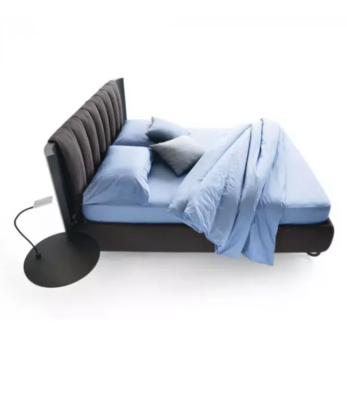 Letto HUG 01 LINES H27, accessoriabile di comodino, caricabatteria e lampada. La testiera e il comodino sono disponibili in legno in essenza o laminato. È disponibile solo nella versione matrimoniale (larghezza rete 160 centimetri, è ortopedica a 14 doghe in betulla). I piedini sono acquistabili in 3 diversi colori, il giroletto e i cuscini sono completamente sfoderabili.