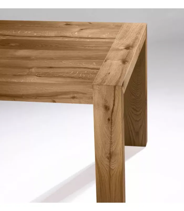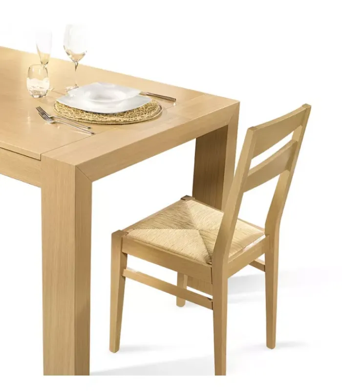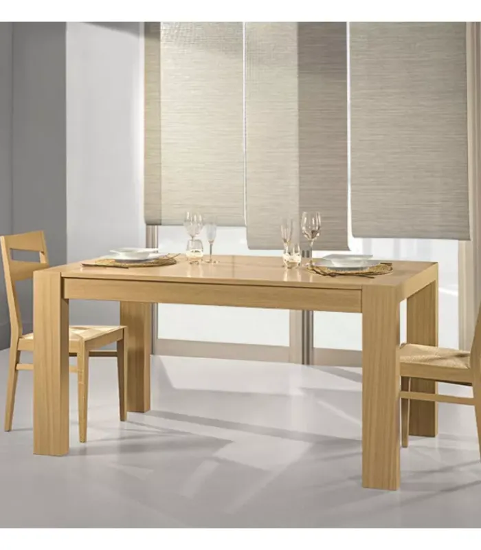 Tavolo fisso impiallacciato su truciolare di pioppo. Gambe impiallacciate su lamellare. Dimensioni: H 77 cm, spessore 2 cm, gambe 13,5×7 cm. Disponibile in tutte le finiture.